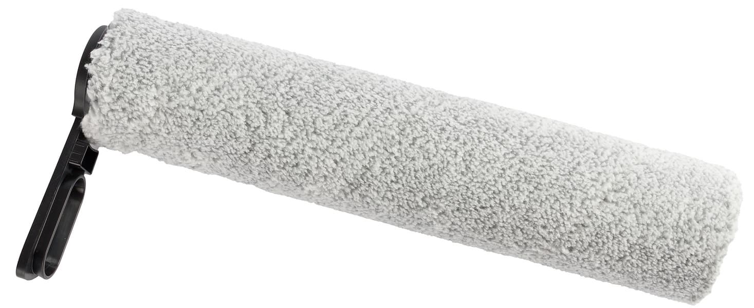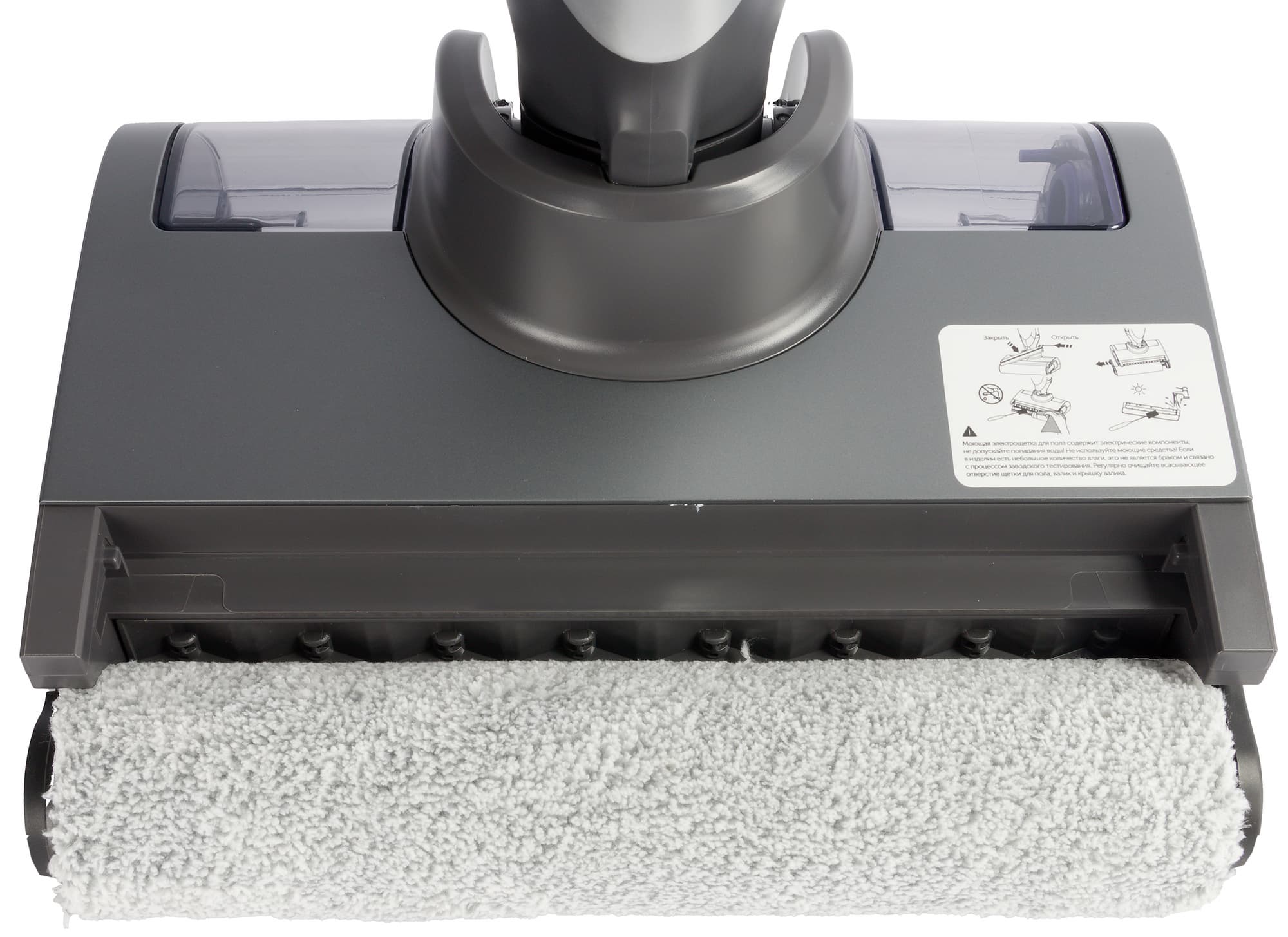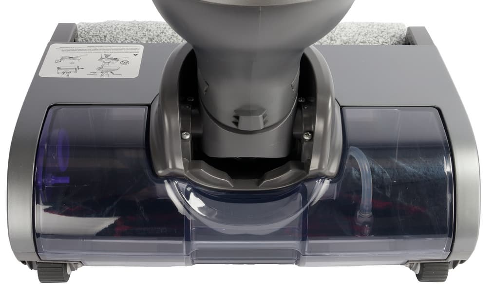 В передней части насадки вращается роликовая щетка из мягкого впитывающего материала. Любопытно, что ротор не прикрыт традиционной полупрозрачной крышкой, защищающей от брызг воды, хотя выступы для ее крепления на корпусе есть. При первом знакомстве с устройством мы даже поискали этот элемент внутри коробки, решив, что он затерялся среди упаковочных материалов, но, ознакомившись с промо-изображениями пылесоса, поняли, что в этой модели защитный кожух не предусмотрен.