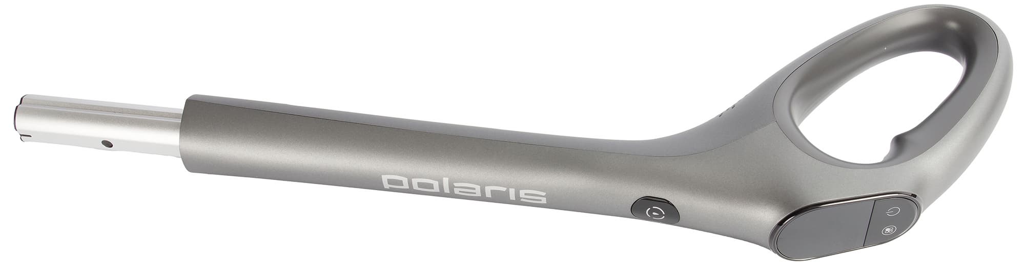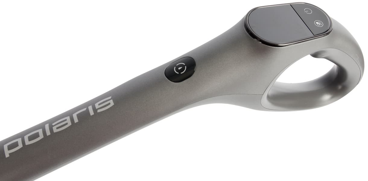 Панель управления пылесосом Polaris PVCW 1080 размещена на ручке и представляет собой светодиодный экран из темного пластика с двумя сенсорными кнопками. Третья кнопка, расположенная чуть ниже, включает режим самоочистки на базе.