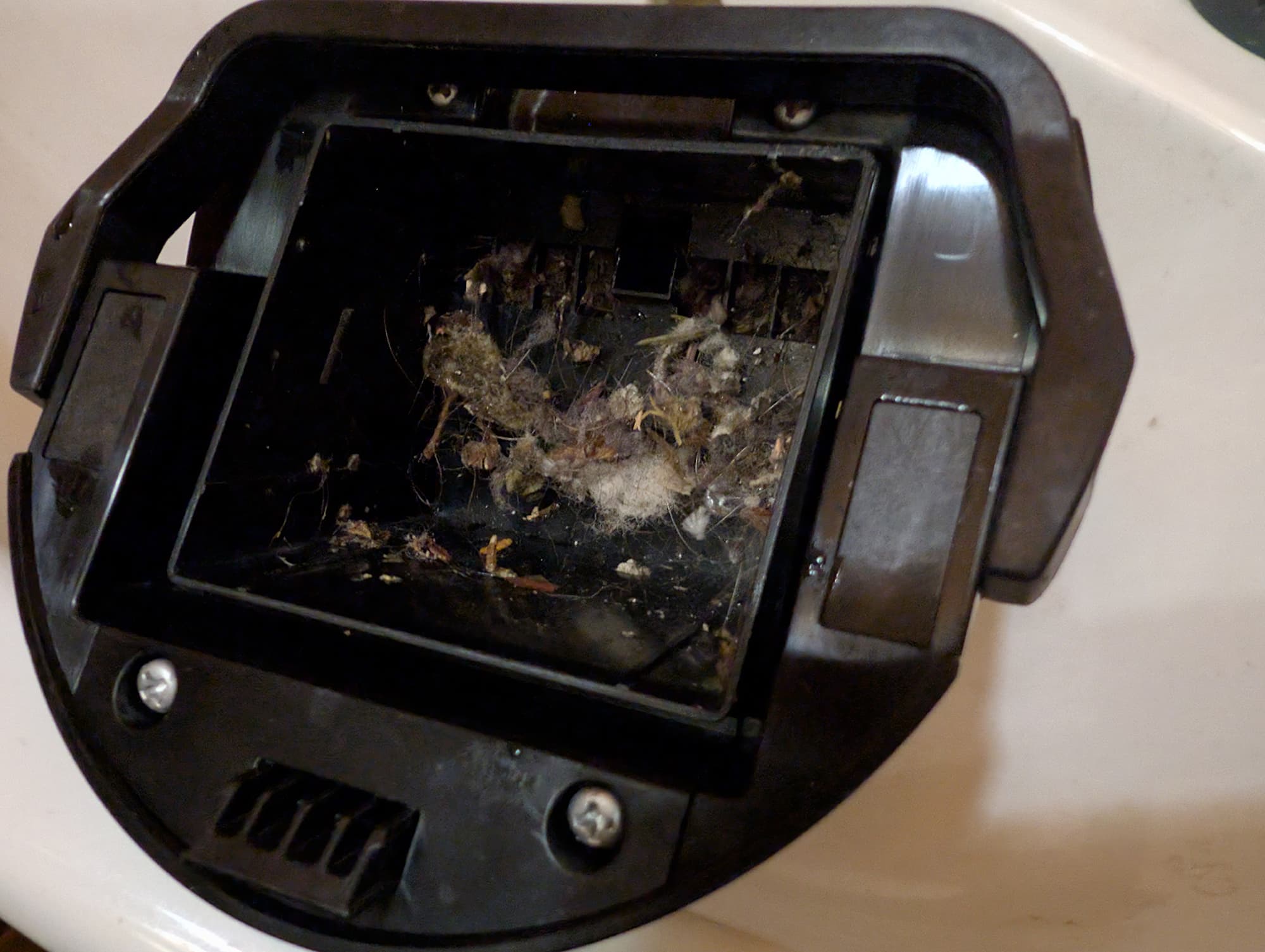 Недостатком конструкции мы считаем отсутствие защитной крышки, прикрывающей щетку: в процессе самоочистки из базы могут вылетать частицы мусора и капли грязной воды.