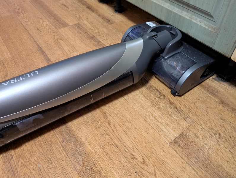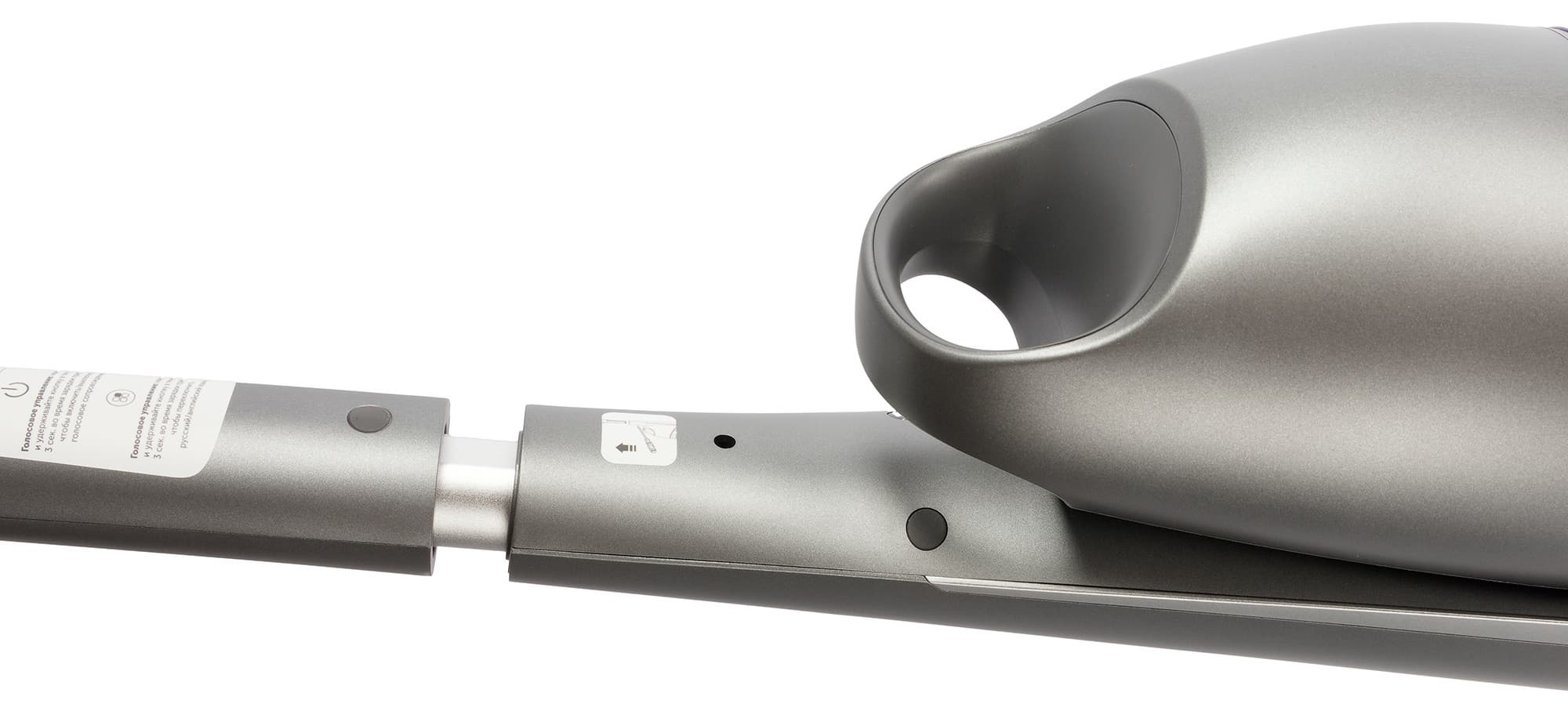 Конструкция пылесоса позволяет опустить корпус почти параллельно полу. В этой конфигурации запускается режим уборки под мебелью: устройство переходит на пониженные обороты, а индикация дисплея отключается.