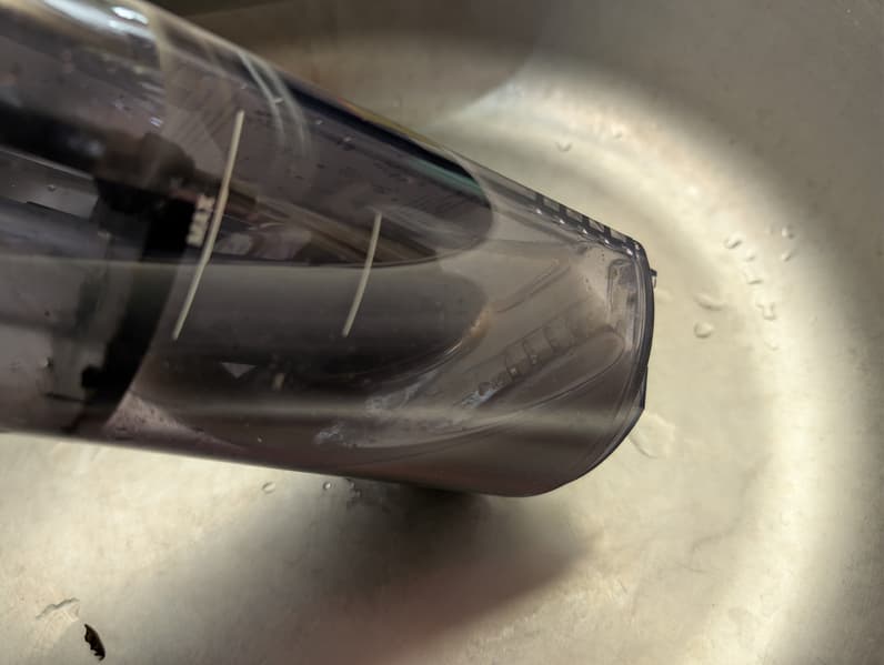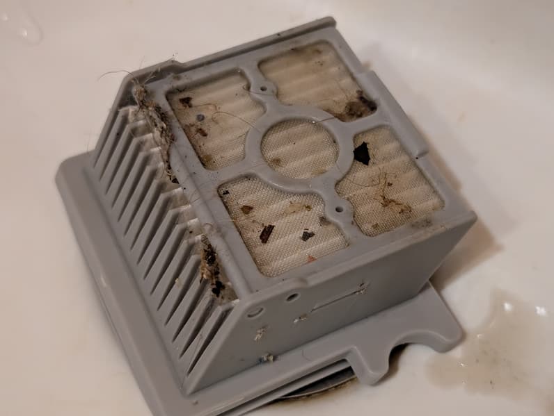 Очищать резервуар для грязной воды следует после каждой уборки — пылесос напоминает об этой необходимости. При чистке мусоросборника не стоит забывать про фильтр и сетчатый сепаратор: там могут скапливаться твердые загрязнения. Для ухода за контейнером удобно использовать прилагающийся ершик.