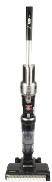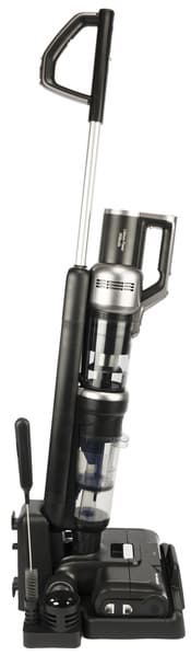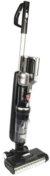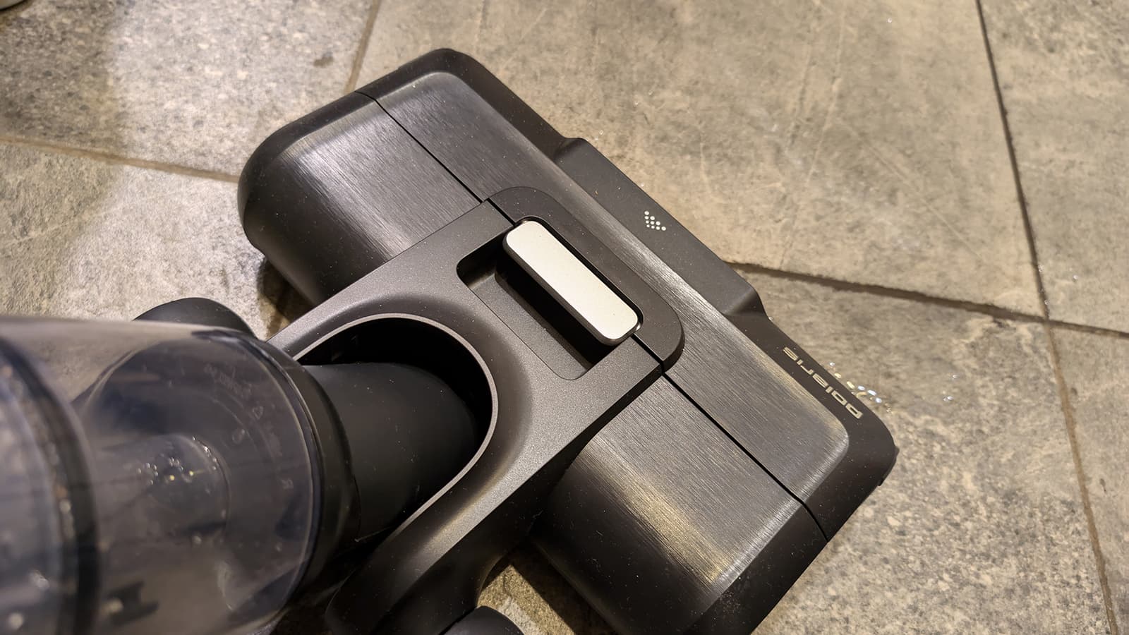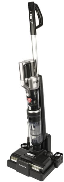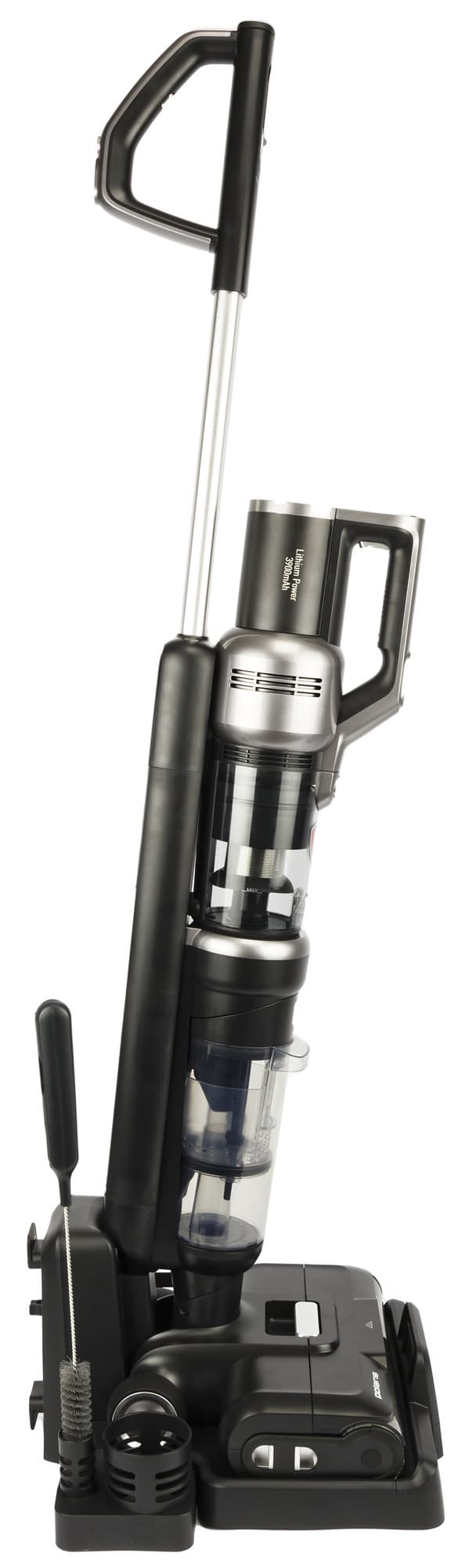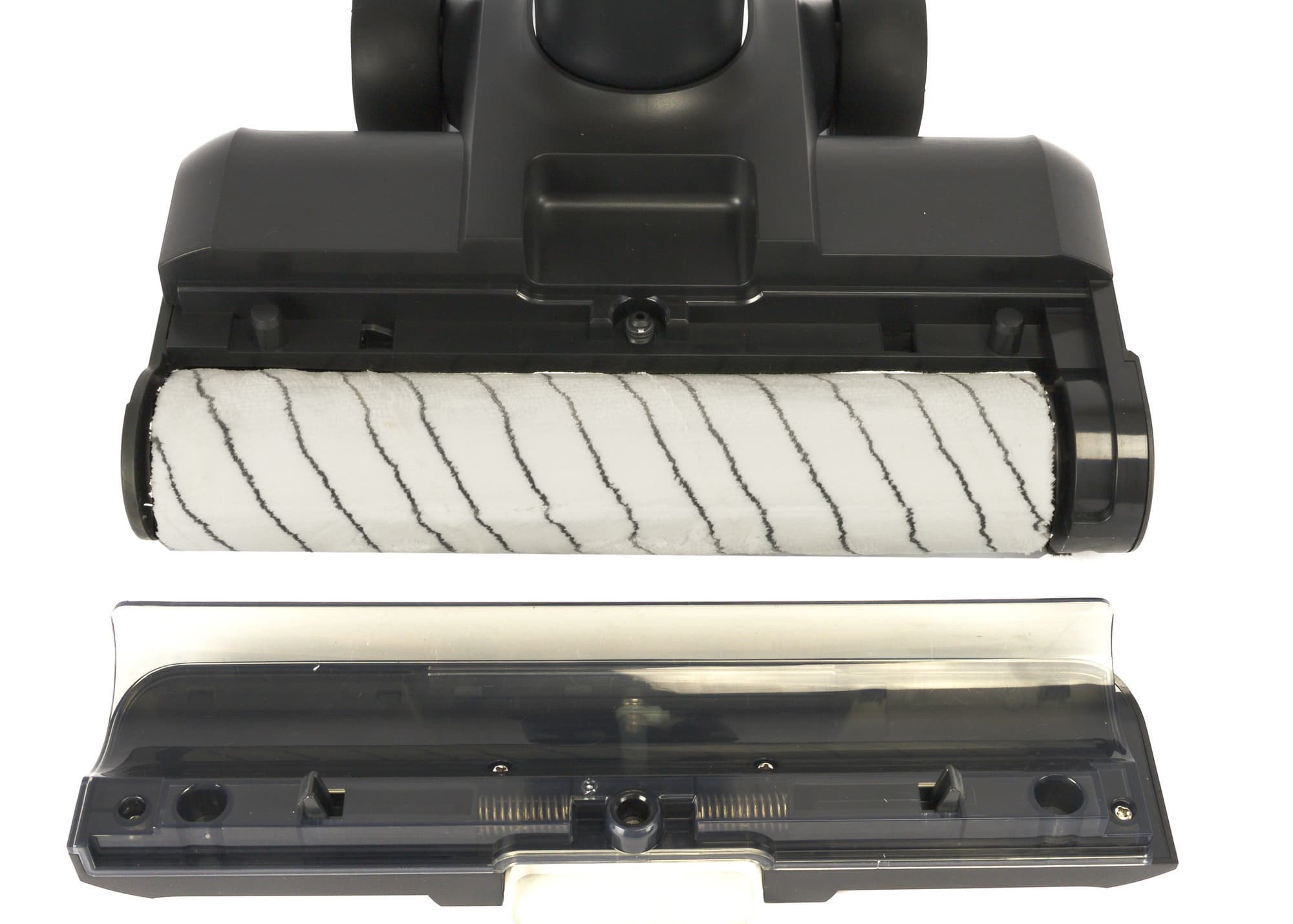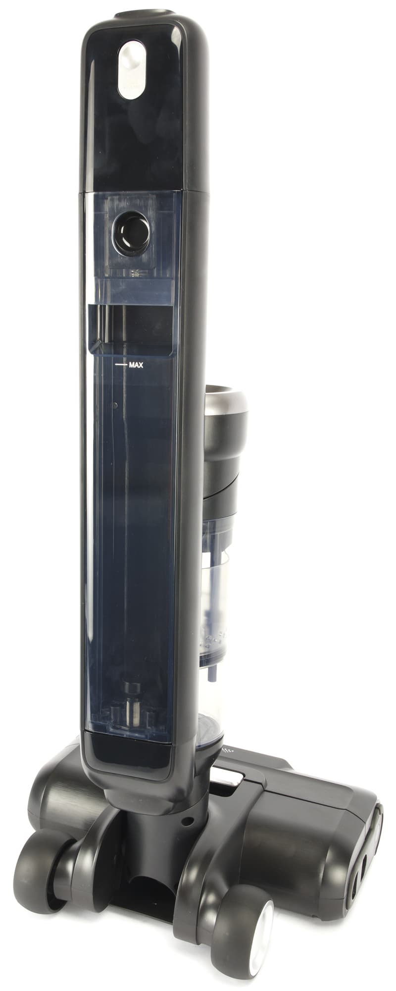 После завершения влажной уборки устройство нужно установить на базу, слить грязную воду из резервуара, наполнить нижний бак чистой и кнопкой на рукоятке запустить режим самоочистки. При этом пылесос автоматически промывает валик электрощетки, а затем включает режим сушки: в течение 4 часов ролик будет обдуваться потоком воздуха при помощи встроенного в базу вентилятора.