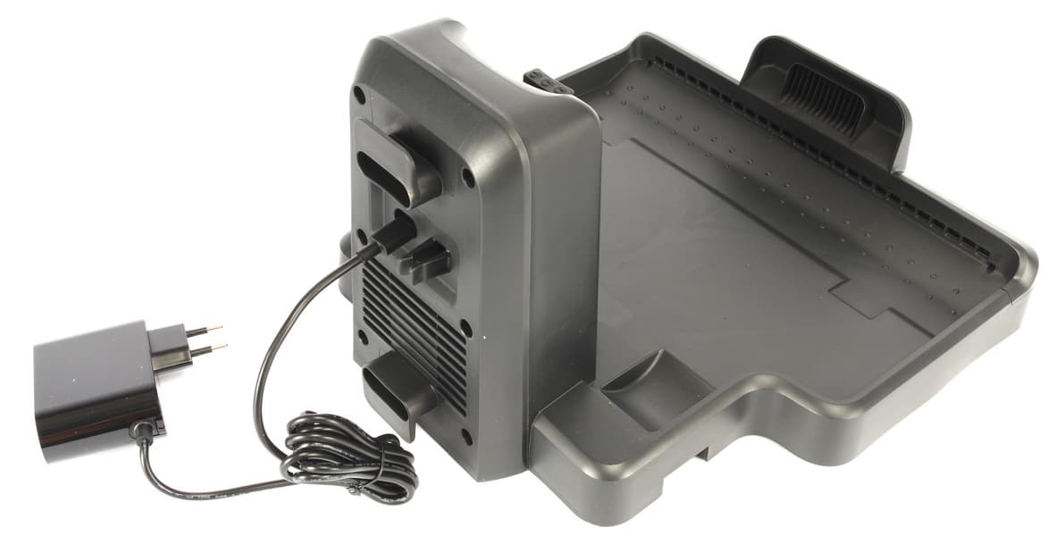 Для обслуживания и зарядки предназначена базовая станция из черного пластика. В передней части ее плоского поддона есть углубление, где при промывке ротора скапливается избыток воды.