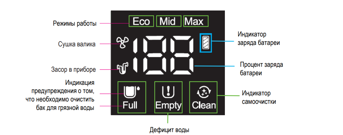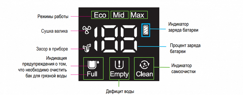 Здесь же производитель предусмотрел место для индикаторов переполнения резервуара для грязной жидкости, отсутствия чистой воды и блокировки электрощетки