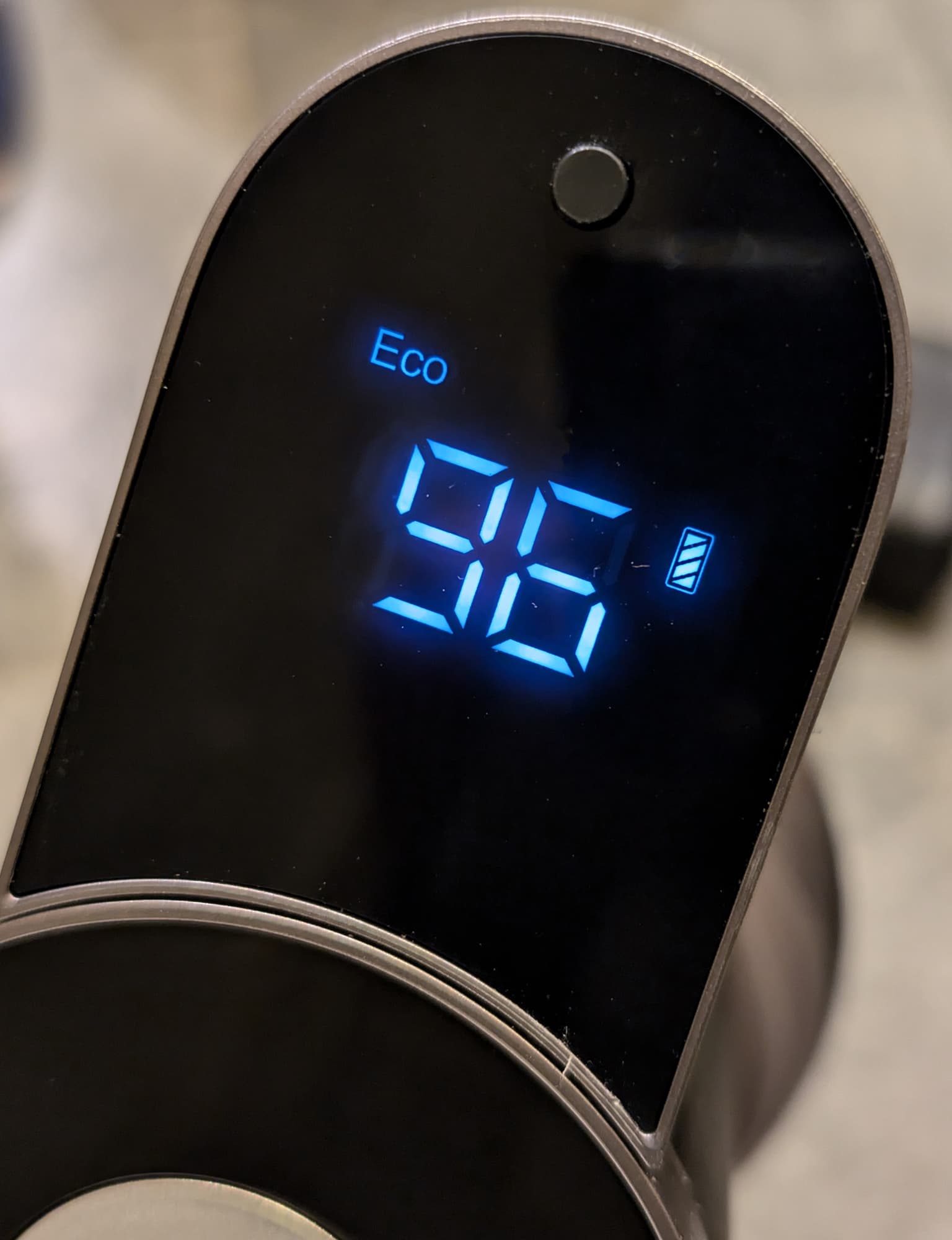 На дисплее пылесоса отображается текущий заряд аккумулятора в процентах и выбранный режим работы: «Min», «Mid» и «Max».