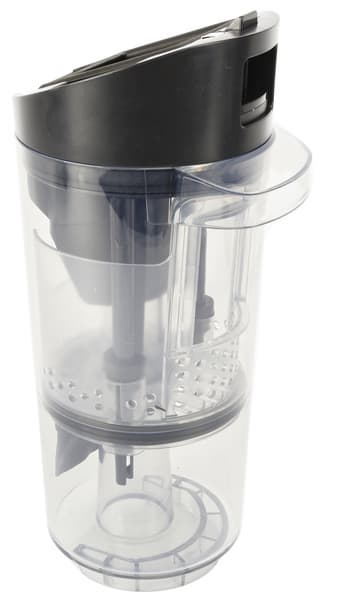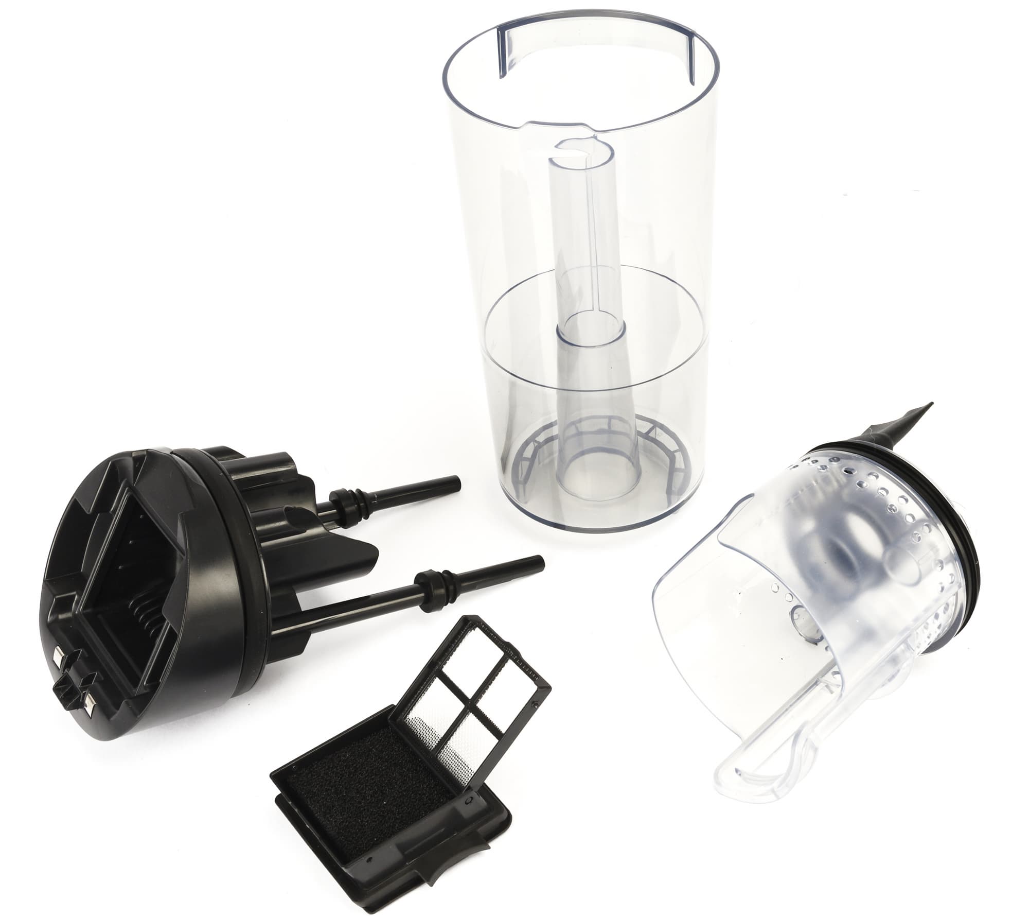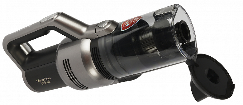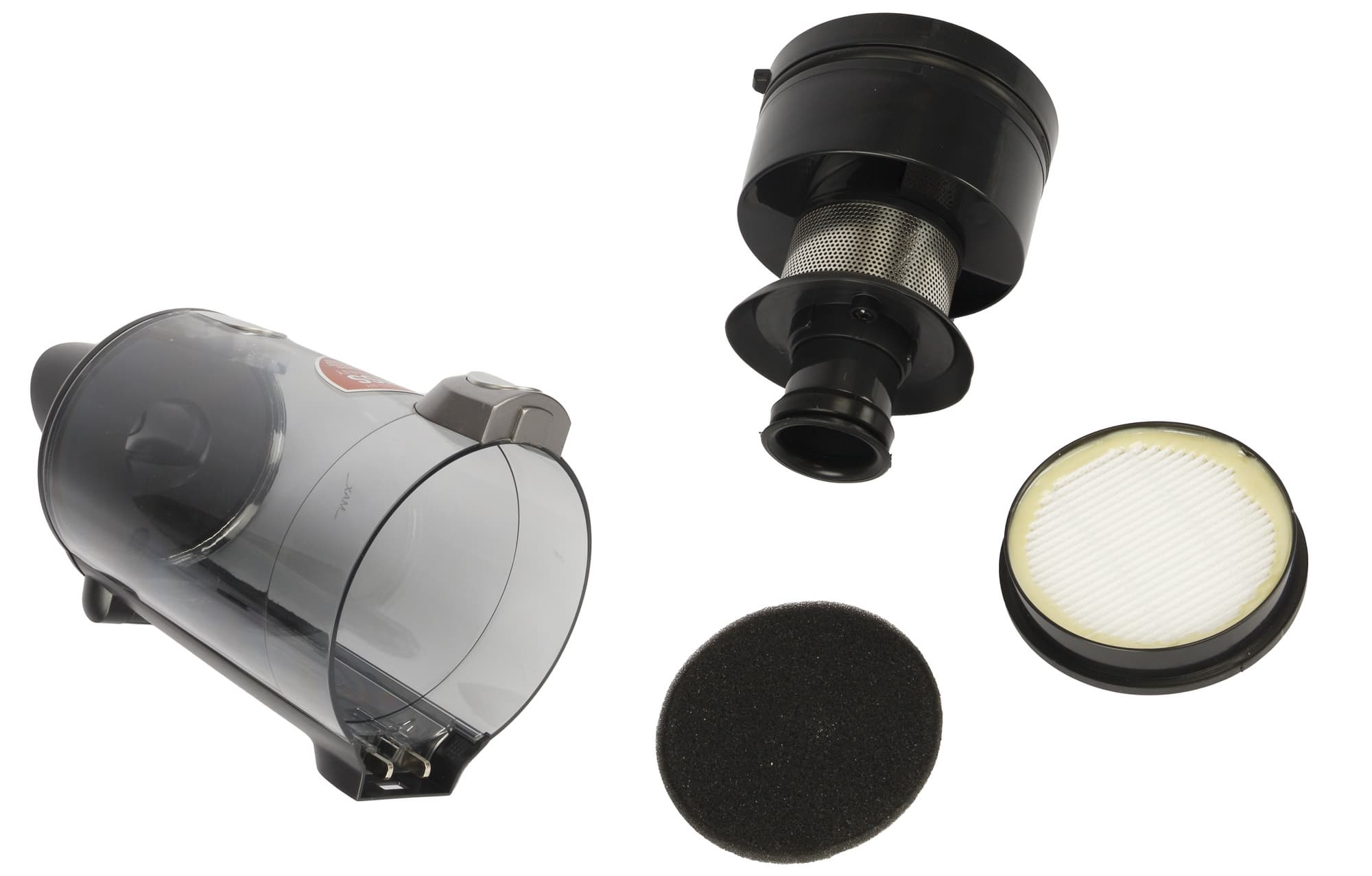 Внутри контейнера из прозрачного серого пластика размещены циклон, снабженный перфорированным сепаратором из стали, предварительный поролоновый фильтр и HEPA-элемент для тонкой очистки.