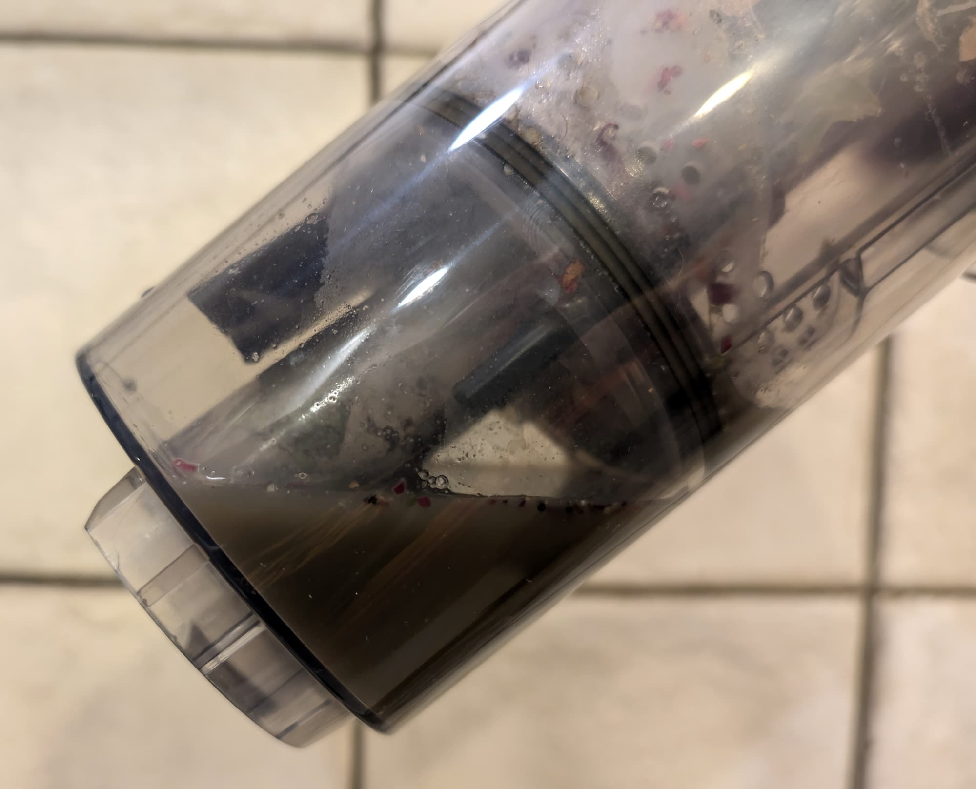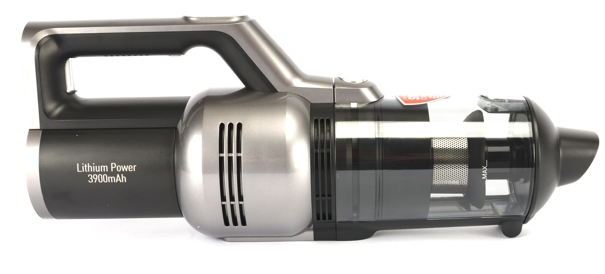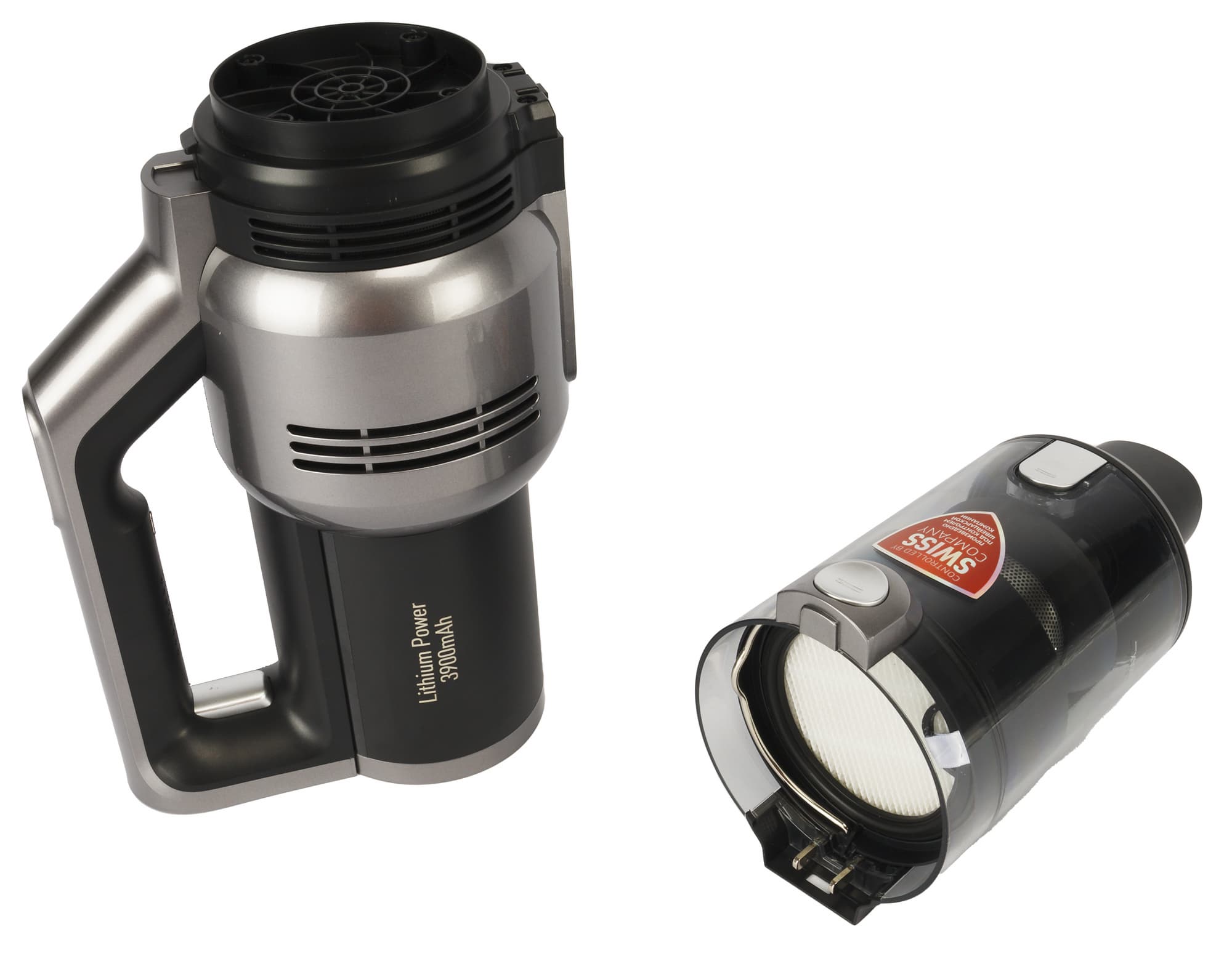 Внутри контейнера из прозрачного серого пластика размещены циклон, снабженный перфорированным сепаратором из стали, предварительный поролоновый фильтр и HEPA-элемент для тонкой очистки.