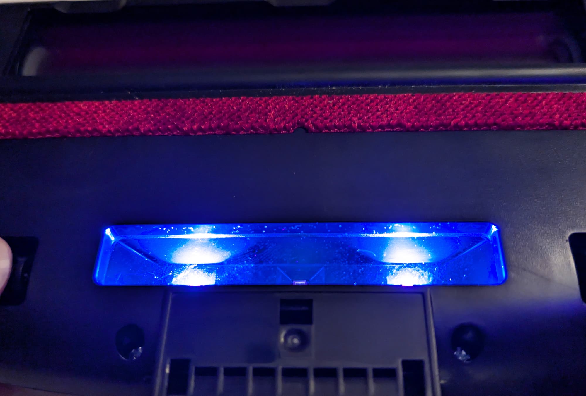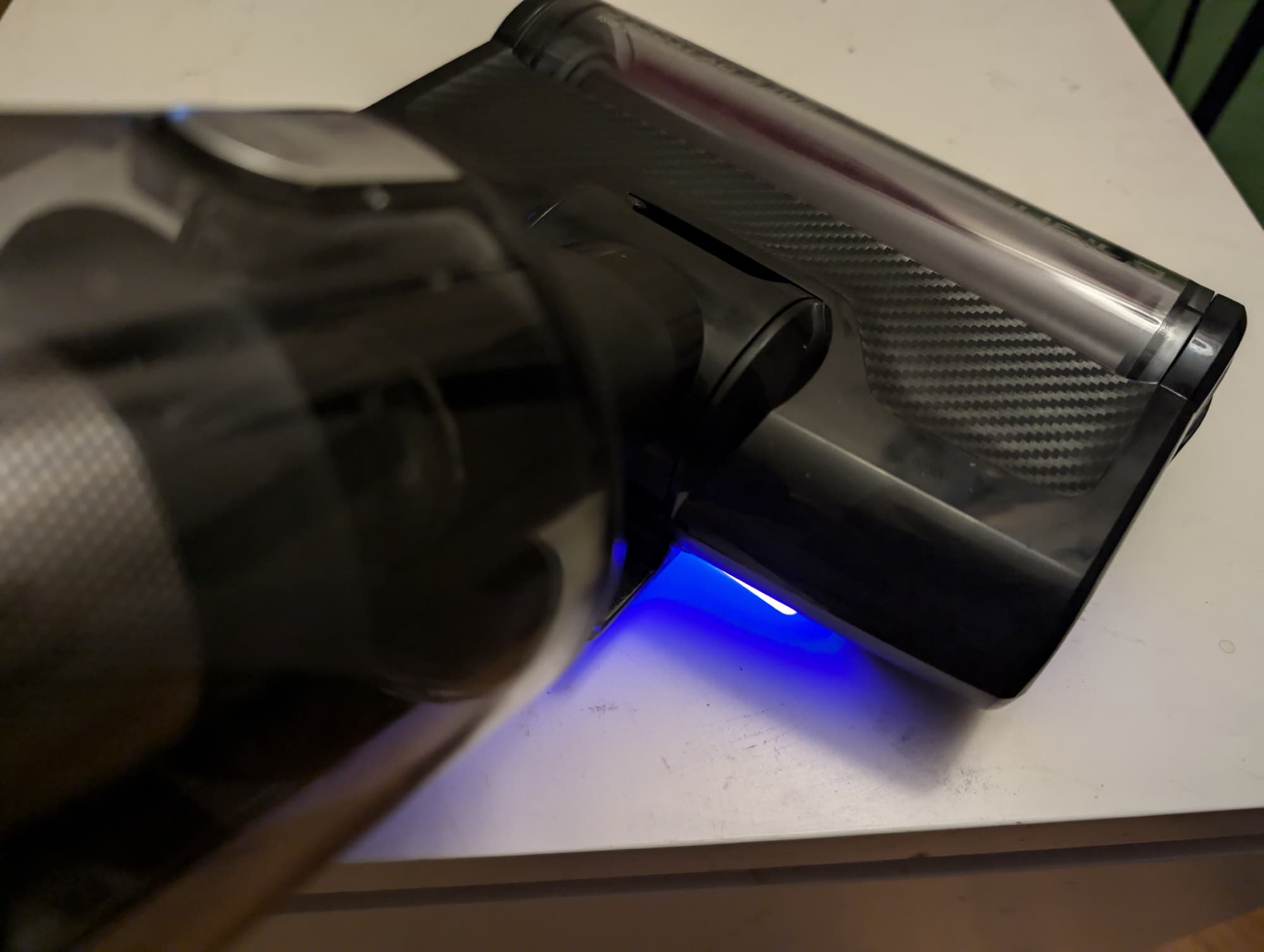 На нижней панели у электрической щетки есть три ультрафиолетовых светодиода, предназначенных, по задумке, для обеззараживания поверхности. Устройство защищает глаза от неполезного для них излучения: излучатель включается только при одновременном касании поверхности обоими подвижными роликами. Такое решение мы видели у многих специализированных пылесосов для матрасов, но в универсальных моделях встречаем впервые.