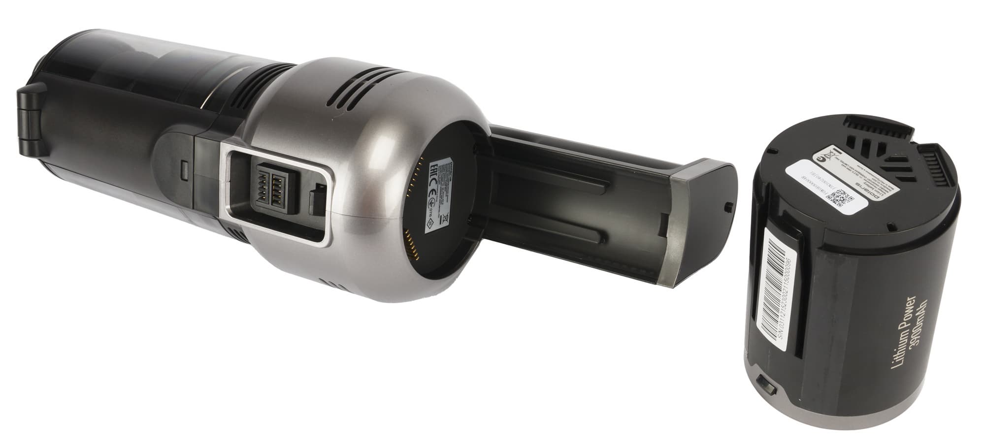 Съемная батарея устанавливается в задней части моторного блока. У литий-ионного аккумулятора весьма неплохая емкость: 3900 мА·ч при напряжении 25,2 В.