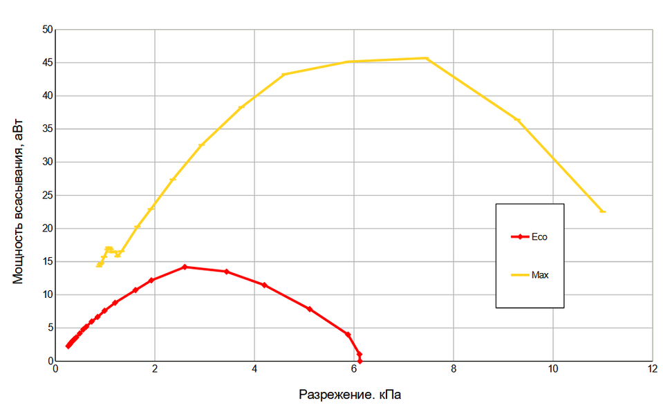 Мощность всасывания (что это такое и как мы ее измеряем, описано в отдельной статье) мы определяли при работе пылесоса без трубы и насадок, в двух режимах. Зависимость мощности всасывания от создаваемого разрежения приведена на графике ниже: