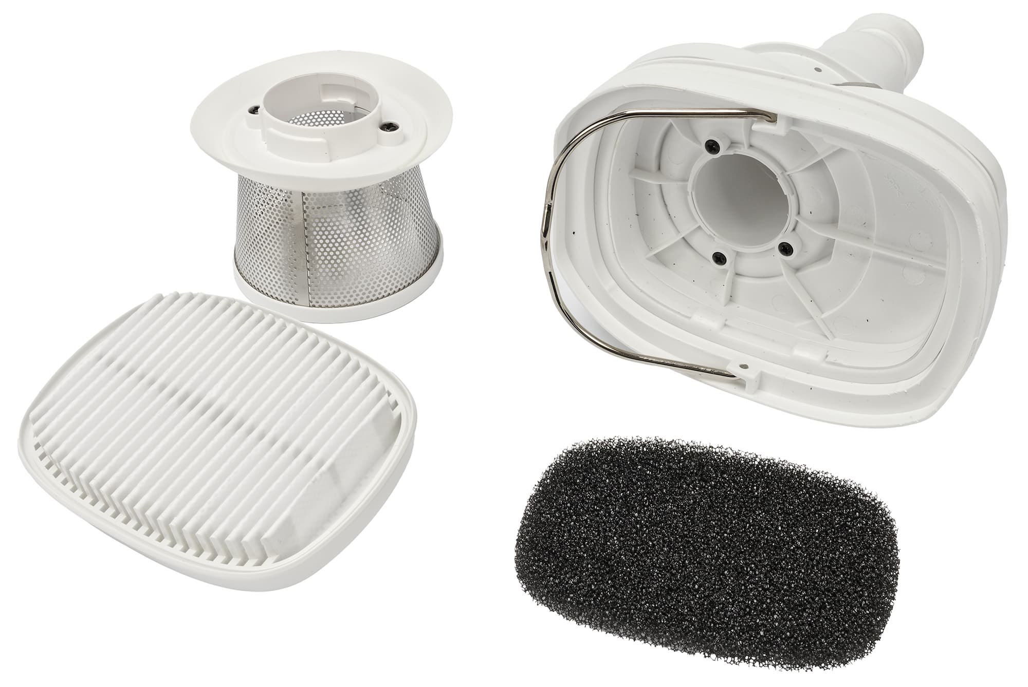 Для очистки контейнера нужно снять фильтрующий блок с помощью откидной ручки, после чего можно вытряхнуть мусор и демонтировать металлический сетчатый фильтр.