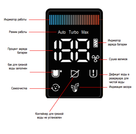 На светодиодном дисплее отображаются уровень заряда аккумулятора, режим работы, сигналы о необходимости добавить чистую воду (или вылить грязную). Также тут может появиться сообщение о засоре.