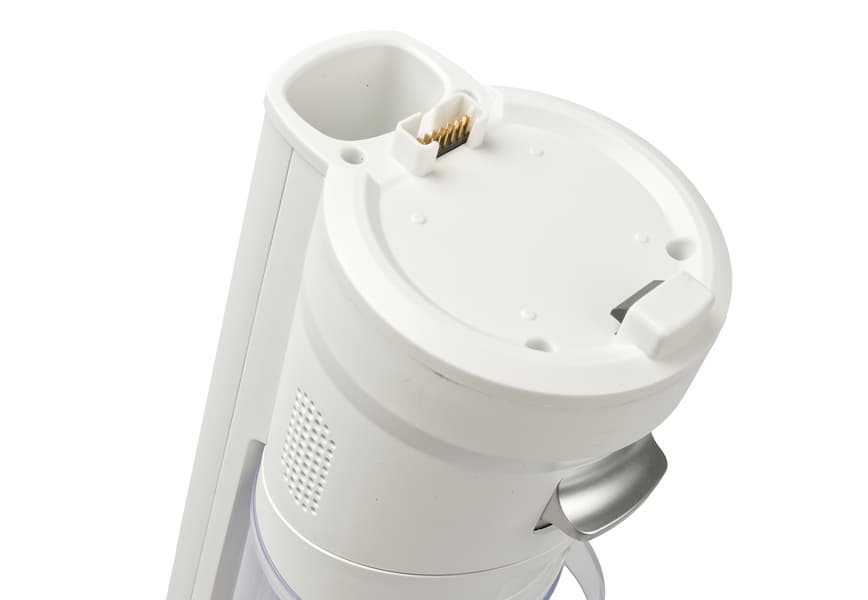 В остальном элементов, заслуживающих внимания, тут не много. С тыльной стороны расположен разъем для подключения провода питания. Сам пылесос устанавливается вертикально и фиксируется на своем месте с помощью небольшой защелки. При этом автоматически включает подзарядка аккумулятора.