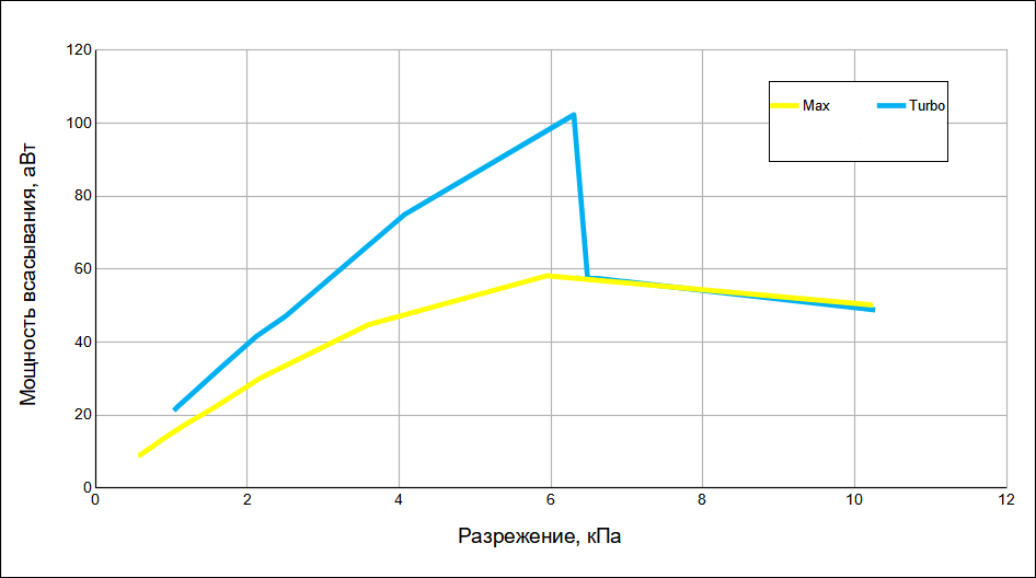 Измеренная нами мощность всасывания составила до 58 аВт в режиме Max, и до 102 аВт — в максимальном режиме Turbo. Это весьма достойный результат для устройств этого класса. Правда, отметим, что режим Turbo при повышении нагрузки автоматически отключается и превращается в тот же самый режим Max. Это хорошо видно на графике.
