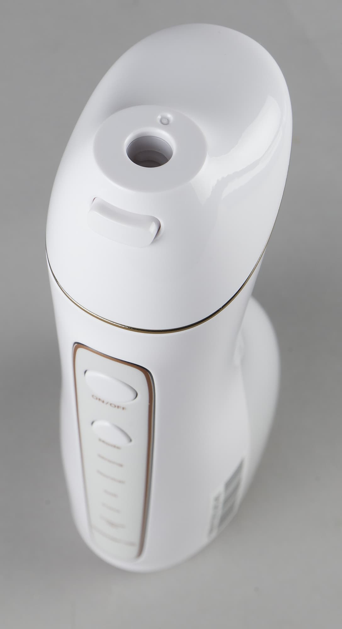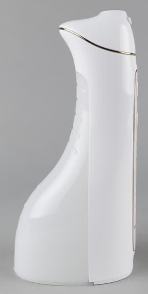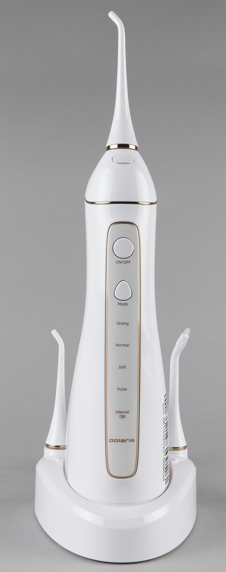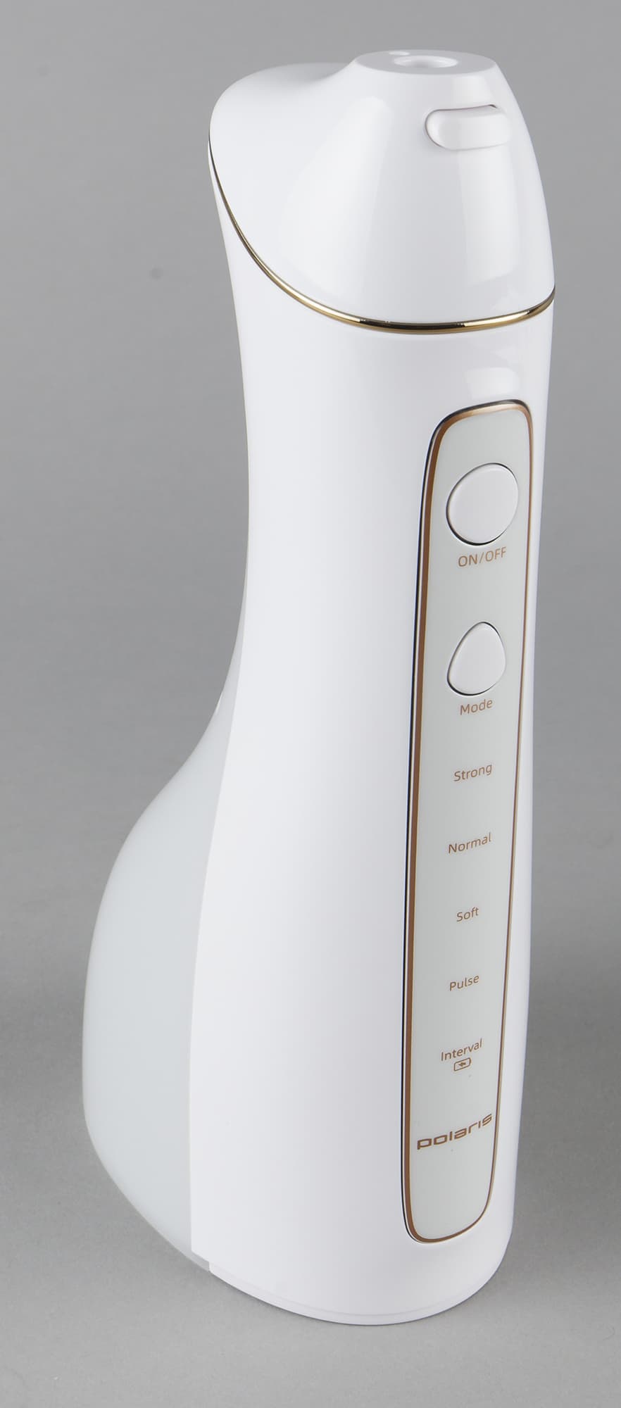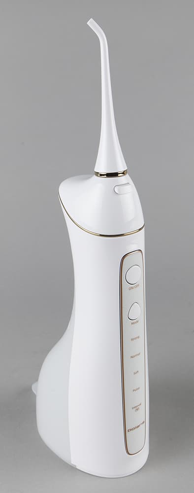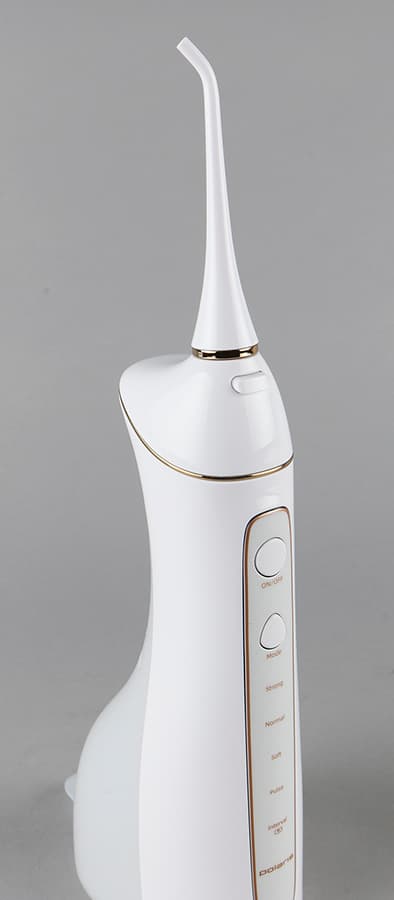 Портативный ирригатор Polaris PWF 0201 изготовлен из гладкого, приятного на ощупь стерильно-белого пластика и декорирован тонким золотистым кантом вокруг панели управления и гнезда для насадки. Благодаря эргономичной форме его приятно держать в руках, да и взор он тоже радует.