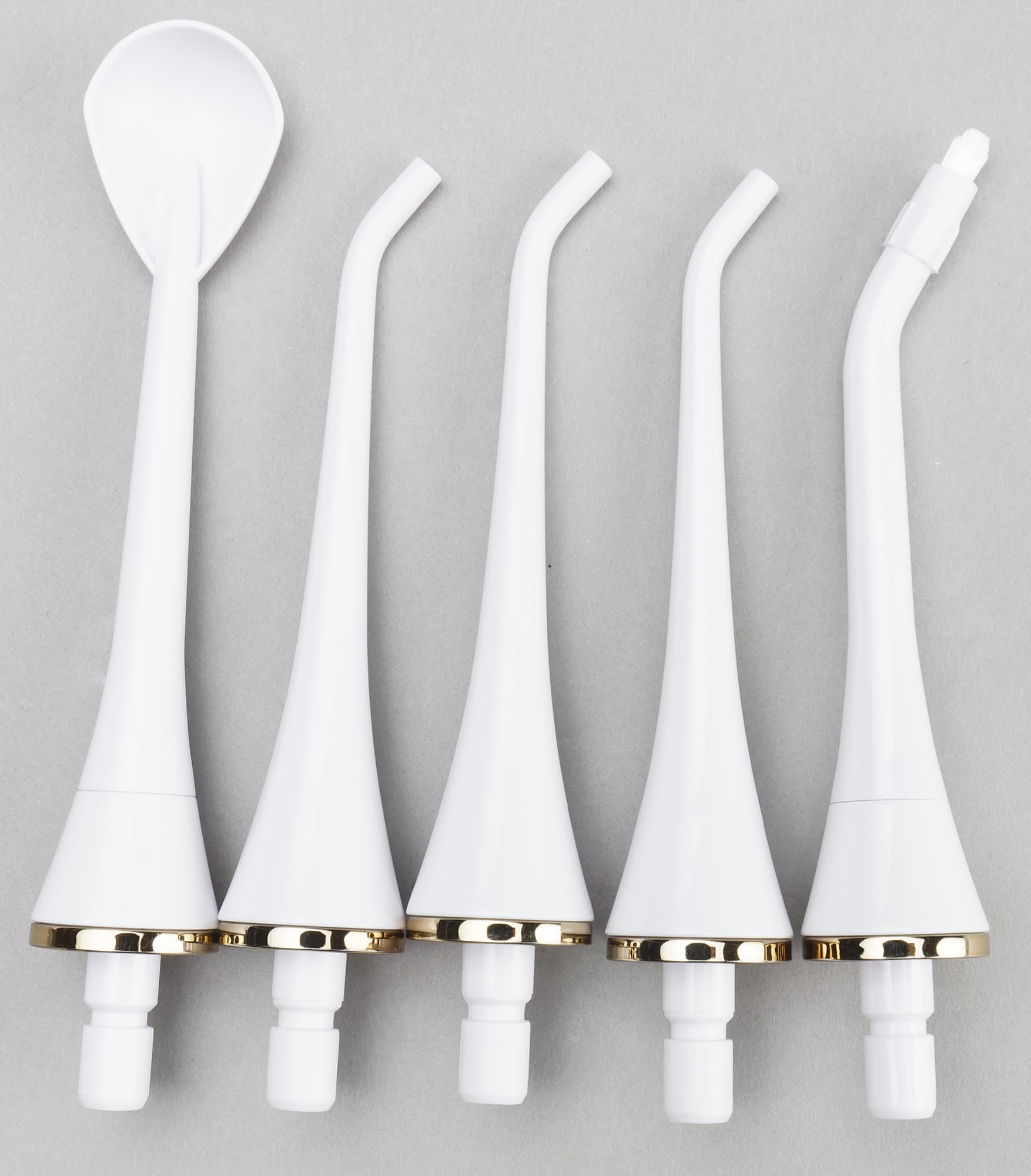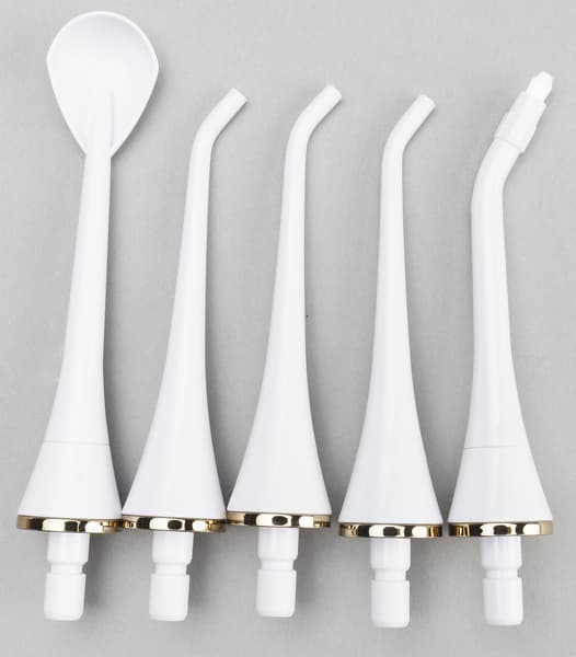 В комплекте пять сменных насадок: три обычные струйные (в центре) предназначены для стандартной чистки межзубных промежутков от бактерий и частиц пищи. Ортодонтическая щетка (на фото справа) используется для чистки мостов, брекетов, коронок и других искусственных конструкций. Насадка-ложка для чистки языка удаляет с с него бактерии и налет, освежая дыхание.