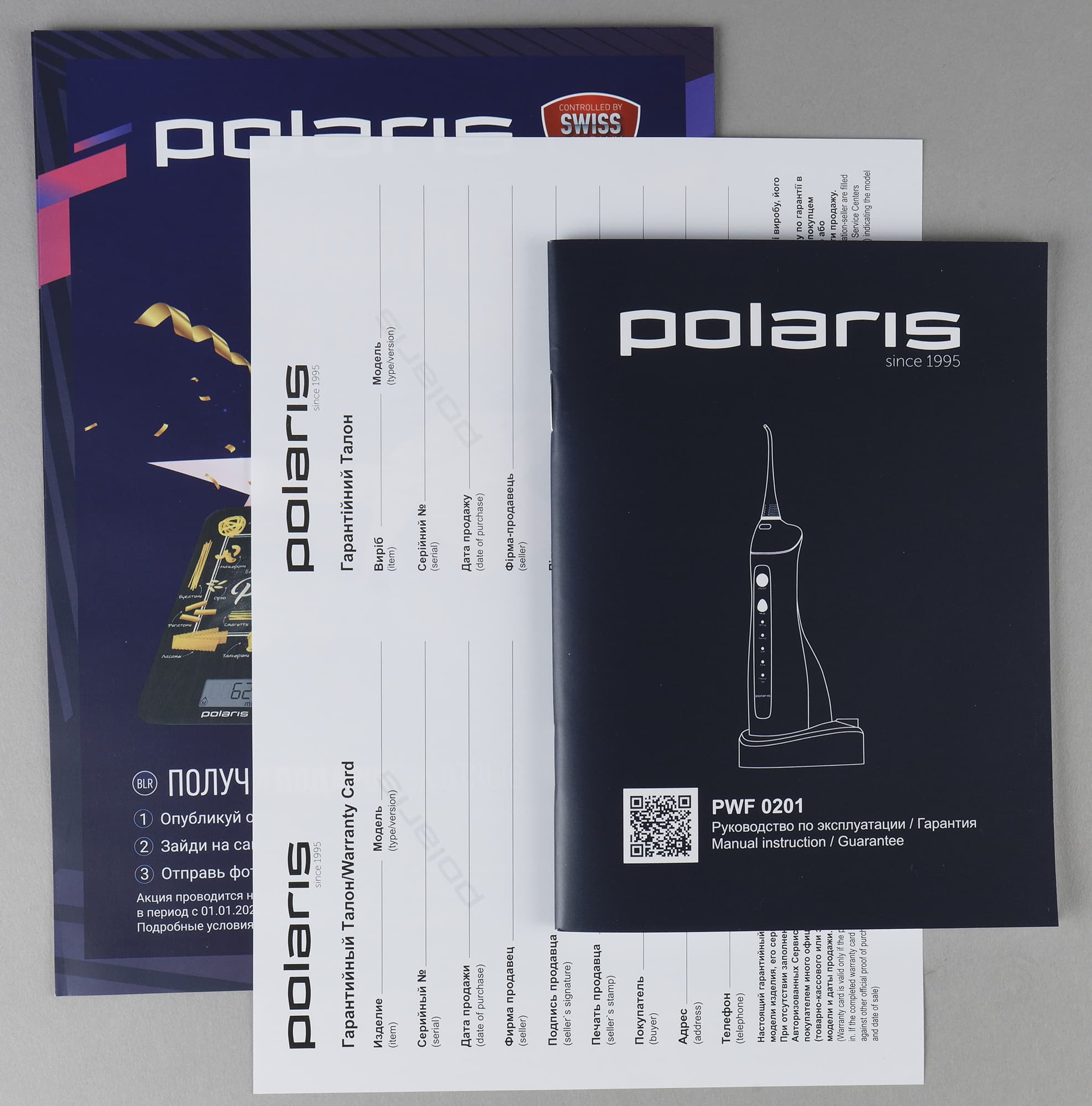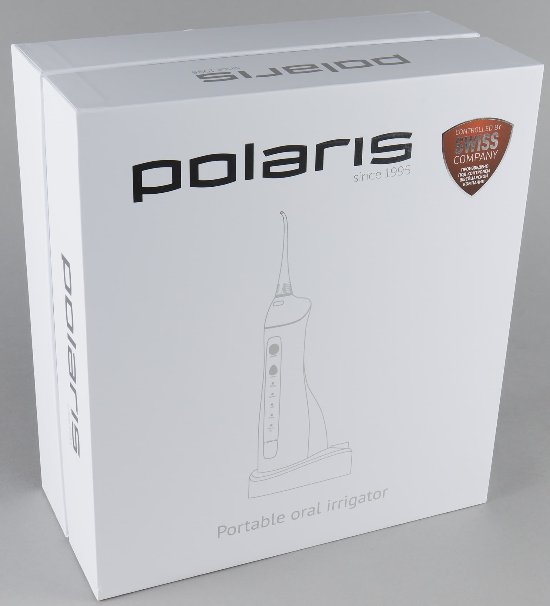 Информации на упаковке немного: на верхней крышке имеется изображение ирригатора на подставке, размещен логотип производителя и обязательный для Polaris значок, напоминающий, что устройство произведено под контролем швейцарской компании. Прибор сделан в Китае, но производитель гордится своими европейскими корнями.