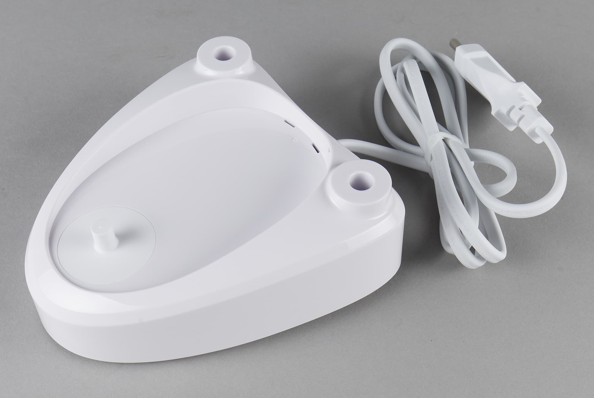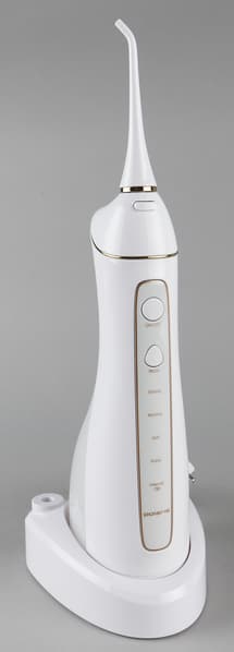 Прибор комплектуется с базой для беспроводной зарядки, которая также служит подставкой для самого ирригатора с двумя дополнительными насадками.