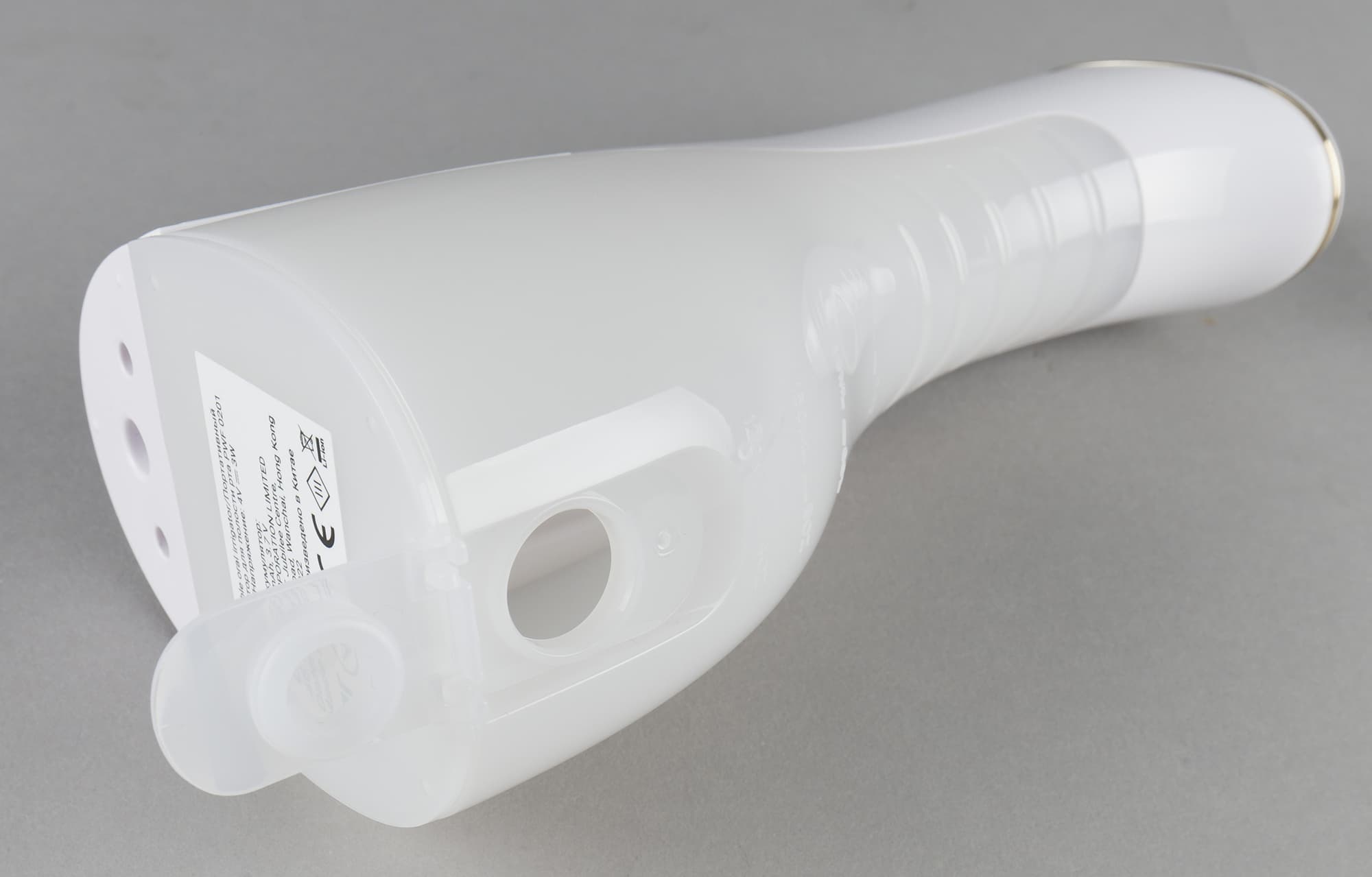 Заливное отверстие резервуара надежно закупоривается откидывающейся пластиковой пробкой, а открывать его легко даже влажными руками. На нижней стороне корпуса есть наклейка с названием модели, серийным номером, информацией об изготовителе и сертификатах соответствия.