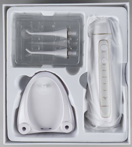 Все части устройства бережно размещены в пластиковых корытцах, которые дополнительно предохраняют их при транспортировке. Корпус дополнительно завернут в защитный пакет, а насадки упакованы в пластиковую коробочку с гнездами-держателями.