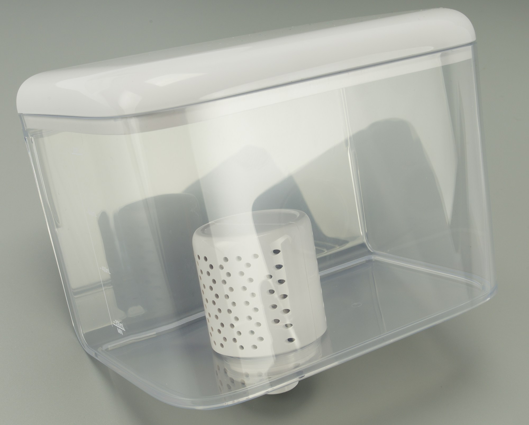 Прозрачный резервуар для воды снимается отдельно, у него собственная крышка из белого пластика, внутрь резервуара специально устанавливается керамический фильтр. Алгоритм установки предельно простой: