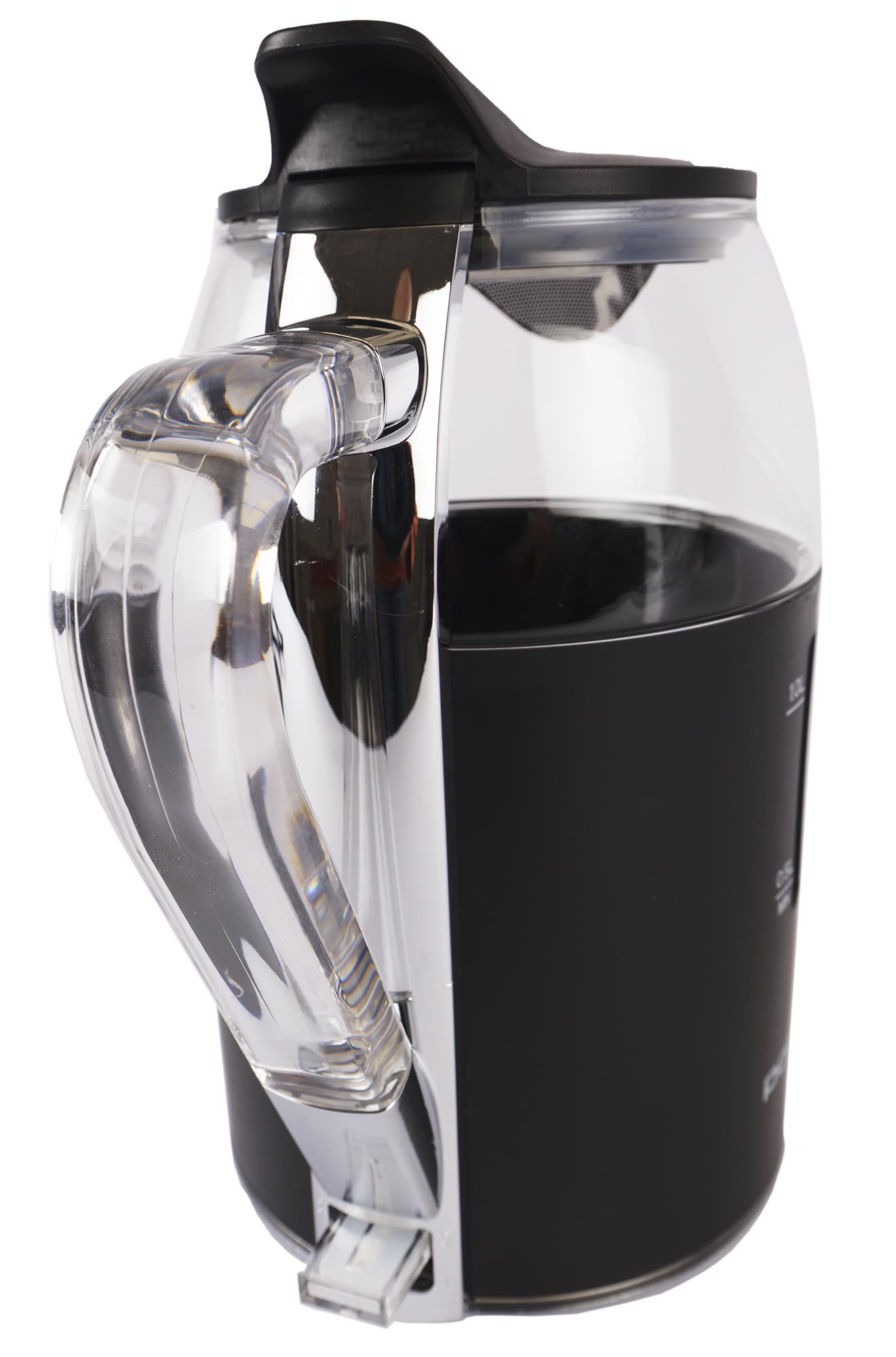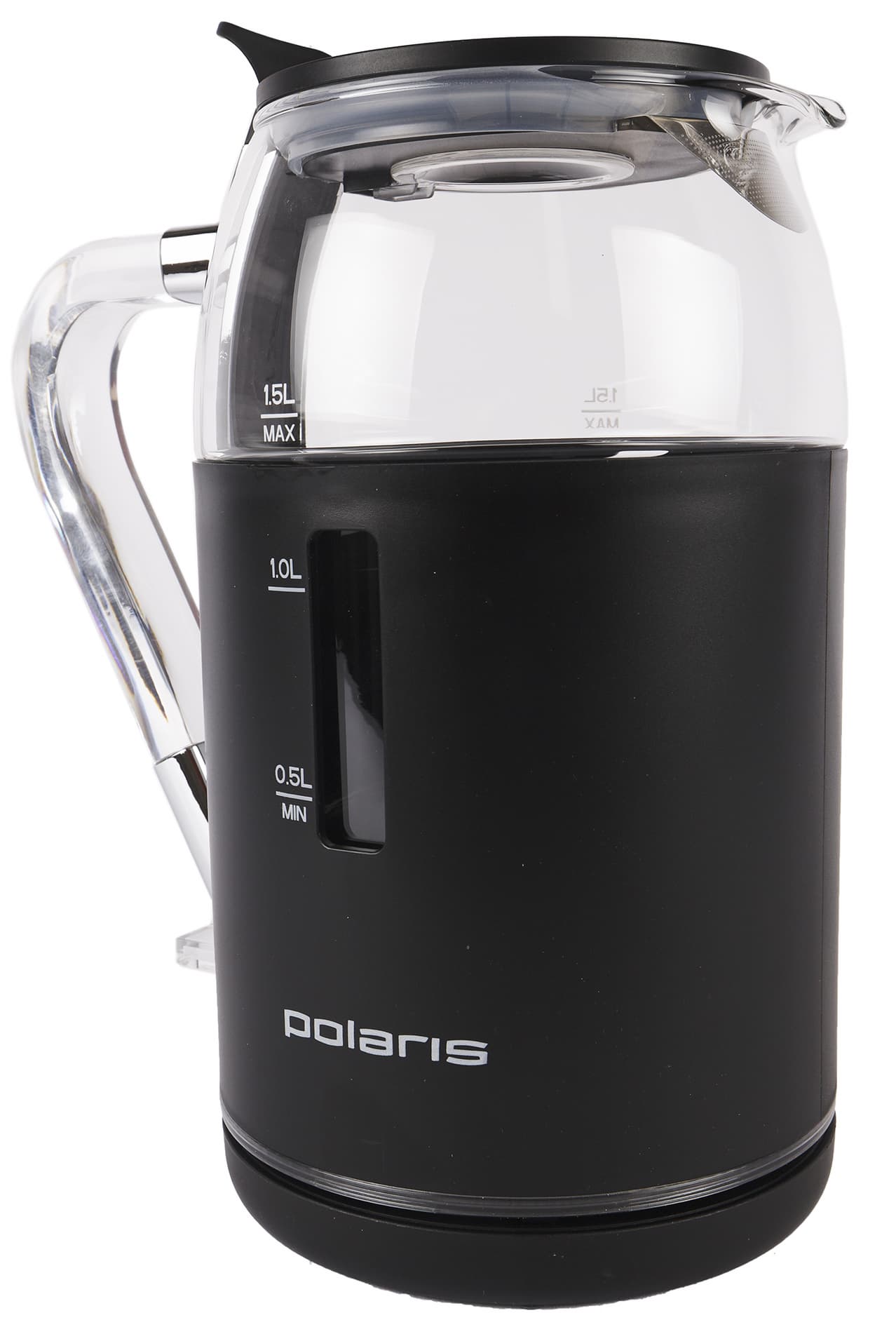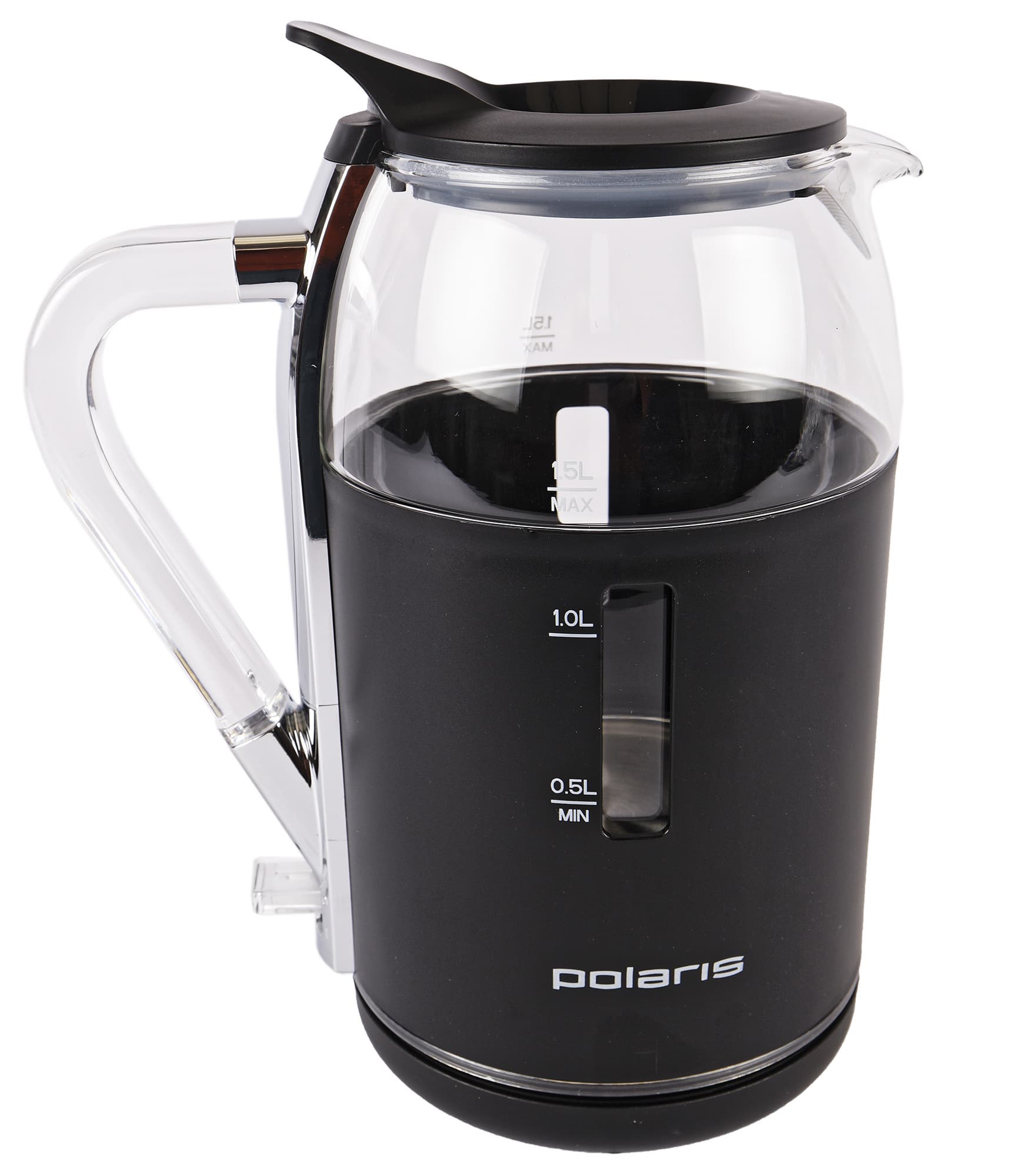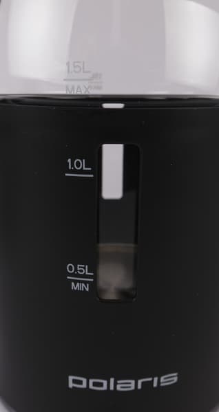 Чайник Polaris PWK 1563CGL имеет черное пластиковое основание и такую же черную крышку. Между ними расположена стеклянная прозрачная колба, нижняя часть которой на ⅔ покрыта изолирующим черным пластиком. Устройство выглядит лаконично, его приятно держать в руках, а двойные стенки, заявленные производителем, как защищающие от ожогов, дарят приятное ощущение качественности и безопасности прибора.