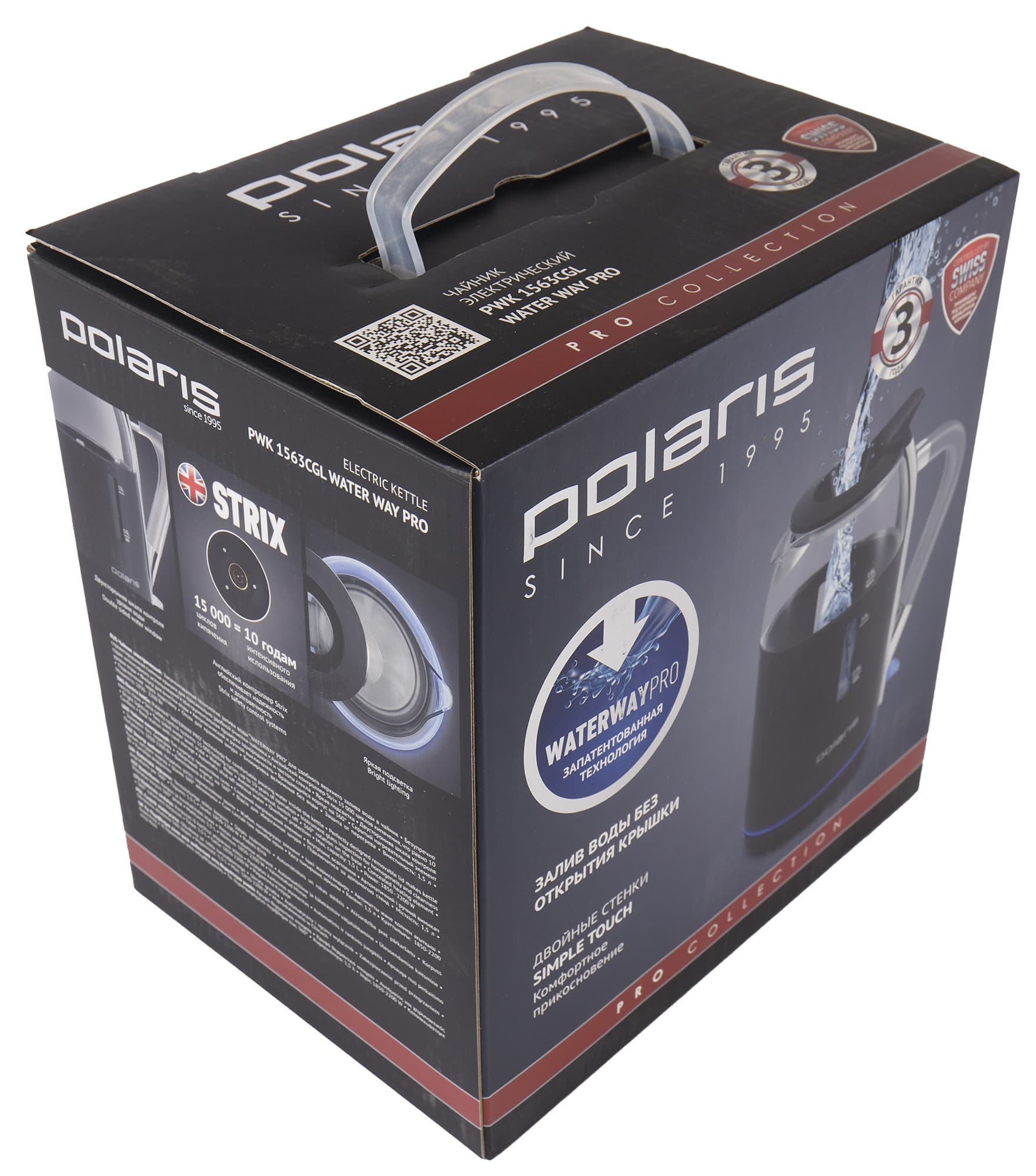Прибор приехал в небольшой прямоугольной картонной коробке черного цвета с пластиковой ручкой сверху. Спереди на коробке указано наименование бренда, модель чайника, размещено красочное фото устройства и указана краткая информация про технологию залива воды Water Way Pro.
