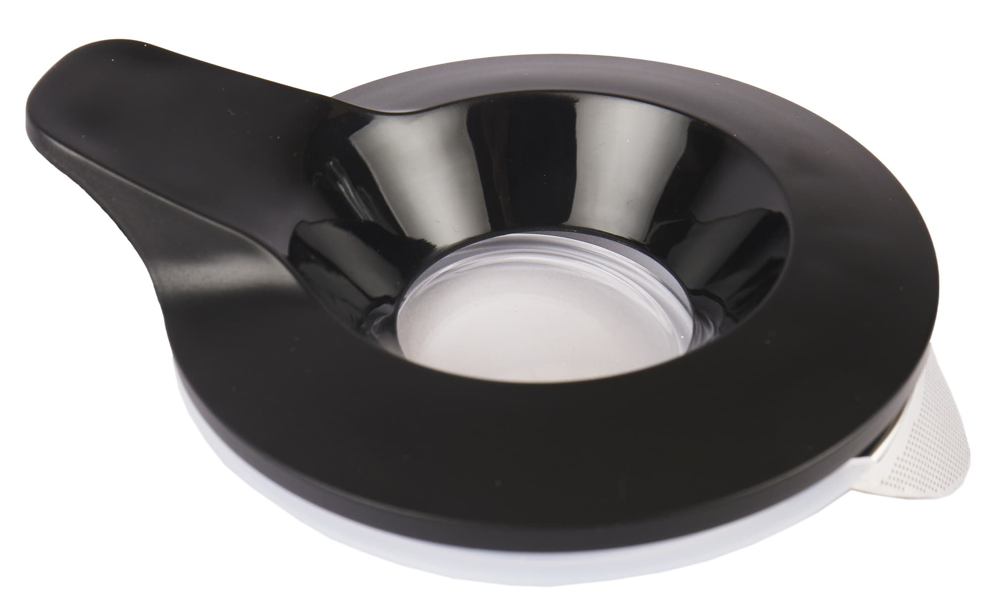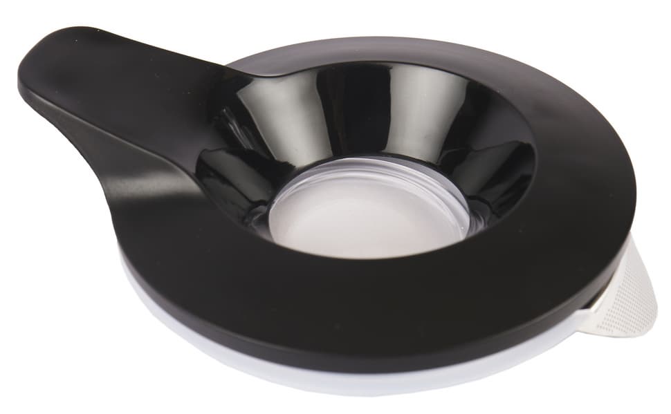 Крышка чайника сделана из черного пластика снаружи и прозрачного пластика по центру. С внутренней стороны по периметру расположено уплотняющее силиконовое кольцо, благодаря которому крышка надежно садится на колбу. Под силиконовой прокладкой располагается металлический фильтр из нержавеющей стали — точно по размеру носика чайника.