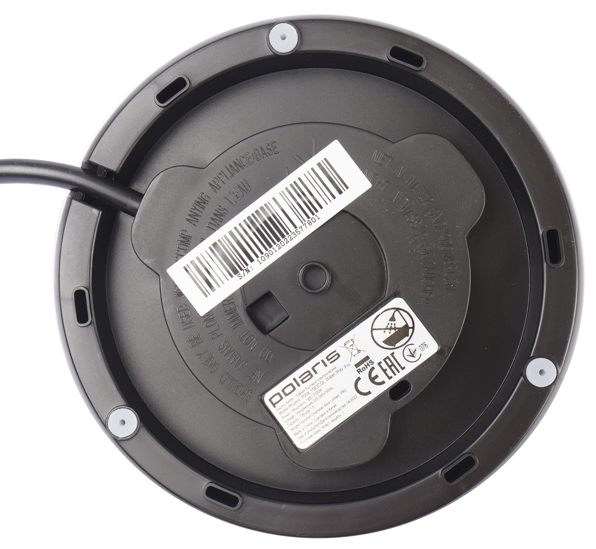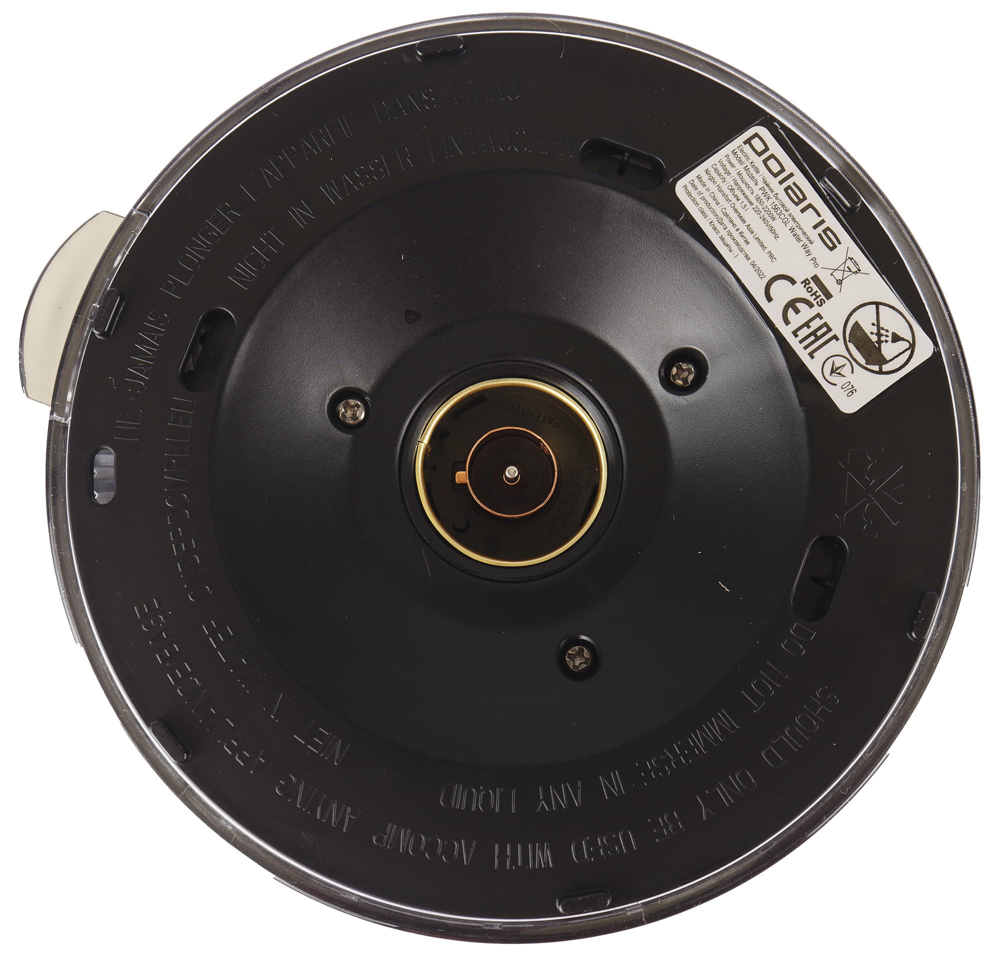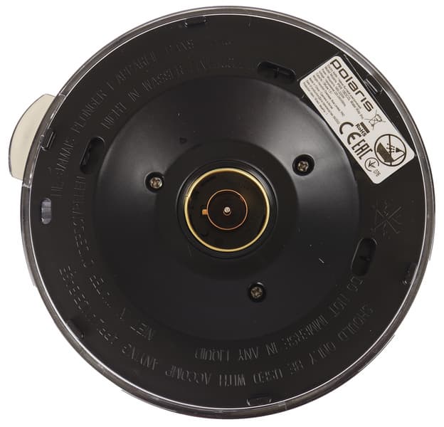 На дне чайника находится шильдик с краткой технической информацией о приборе. Контактная группа, состоящая из одного кольца и центрального штыря, произведена английской компанией Strix — одним из самых известных производителей этих компонентов.