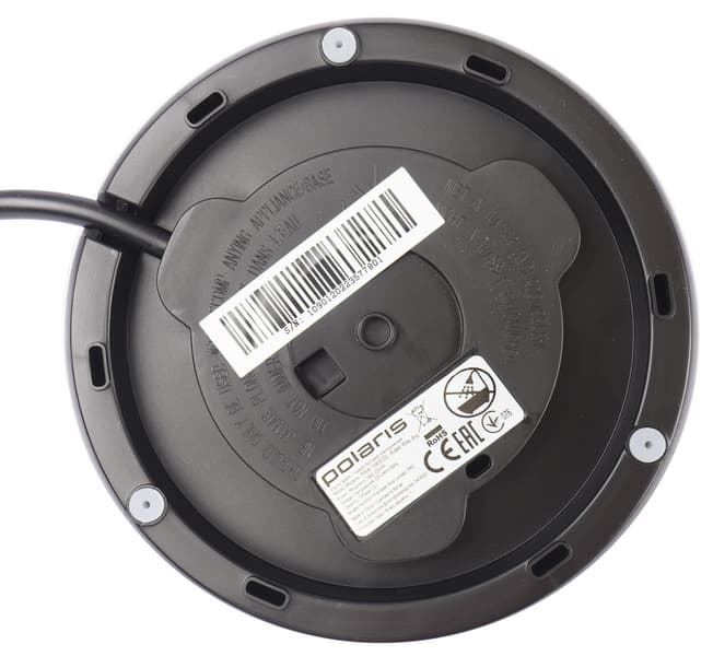 Осмотрев базу снизу, обнаруживаем место выхода шнура электропитания, сам шнур и отсек для его намотки. Производитель добавил три небольшие резиновые ножки, чтобы минимизировать скольжение базы по столу. Здесь также имеется шильдик с краткой технической информацией по прибору.