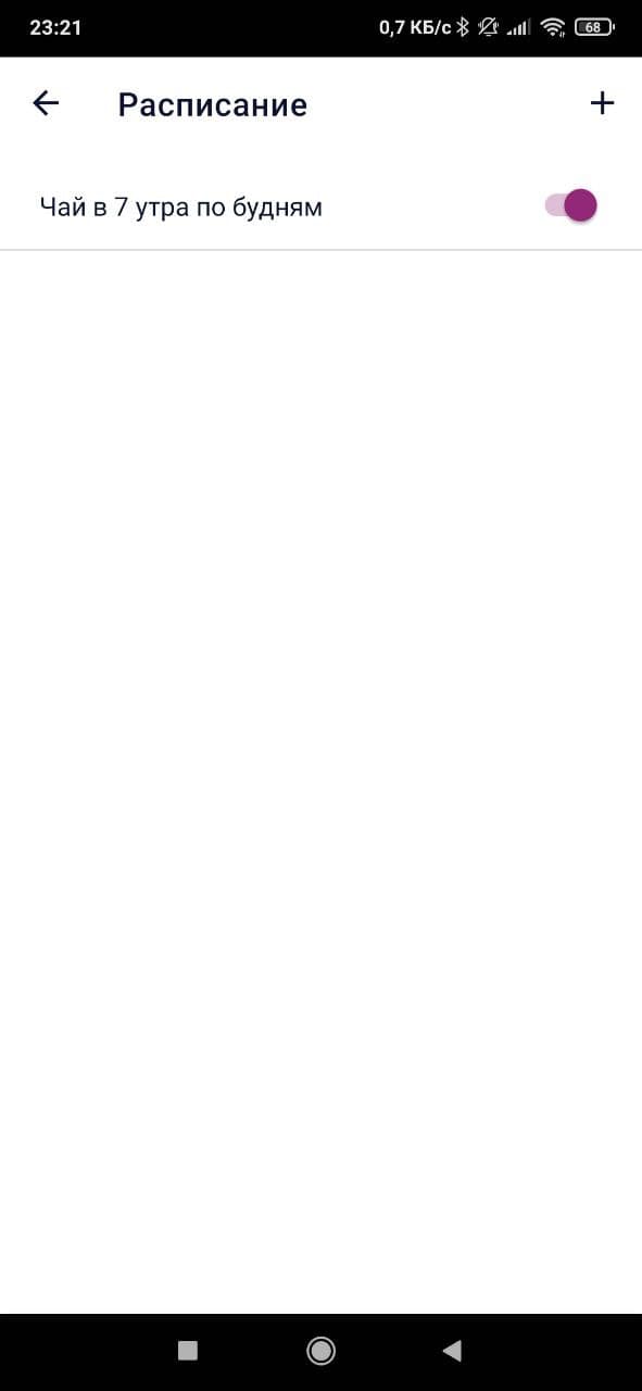 В режиме «расписание» можно задать время включения чайника (с точностью до минуты), температуру (30—100 °C, шаг — 5 °C) и режим нагрева. При этом допускается создания множества различных сценариев, благодаря чему можно гибко настроить множество режимов работы (например, отдельно для будних и рабочих дней).
