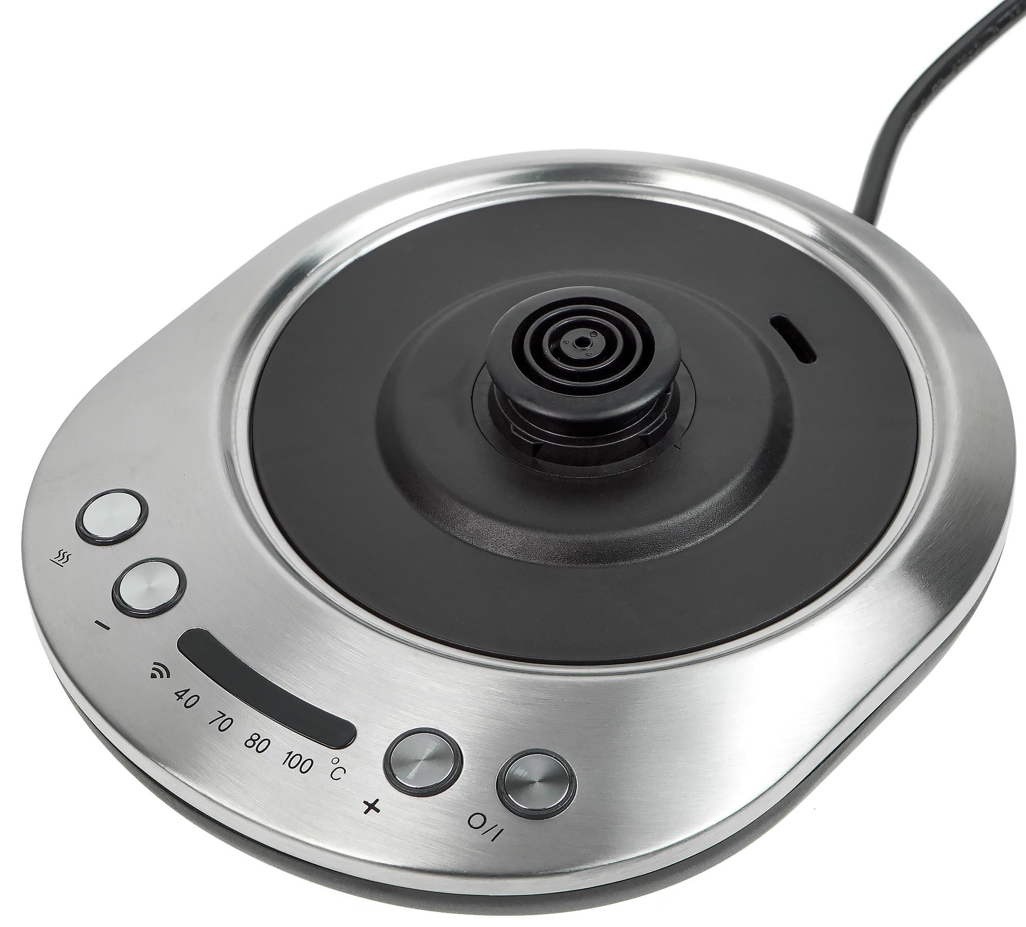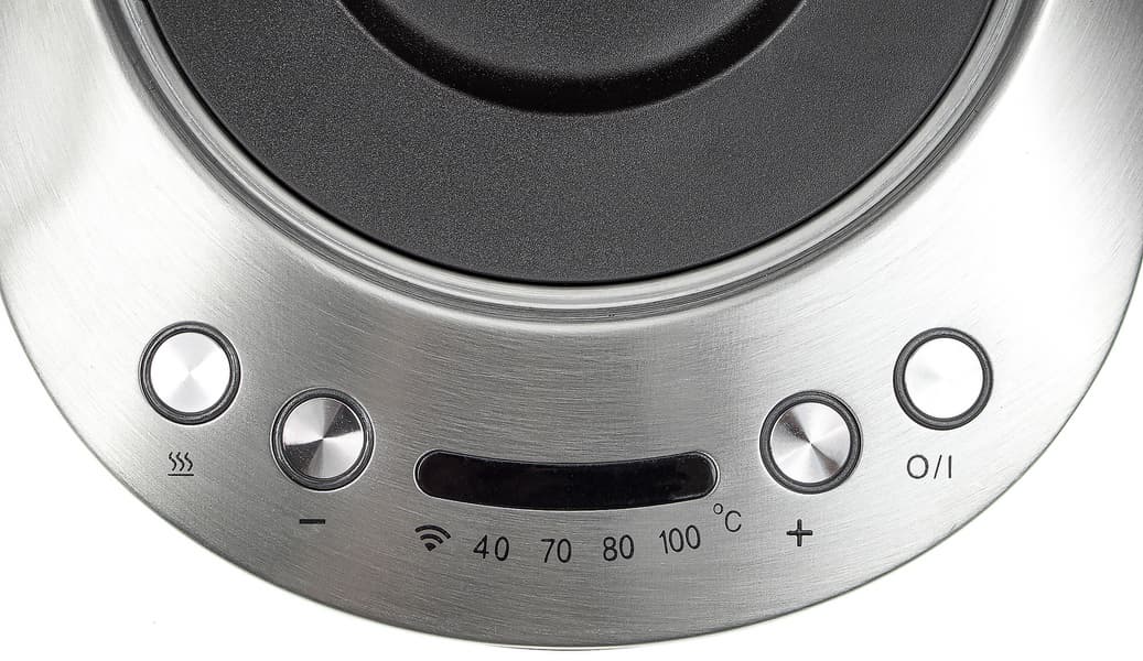 Панель управления состоит из четырех кнопок: «Вкл./Выкл.», «+» и «−» для установки температуры и кнопки поддержания температуры (повторное ее нажатие выключает этот режим). Посередине расположен дисплей: на нем обозначается заданная температура и горит индикатор Wi-Fi, если чайник к нему подключен.