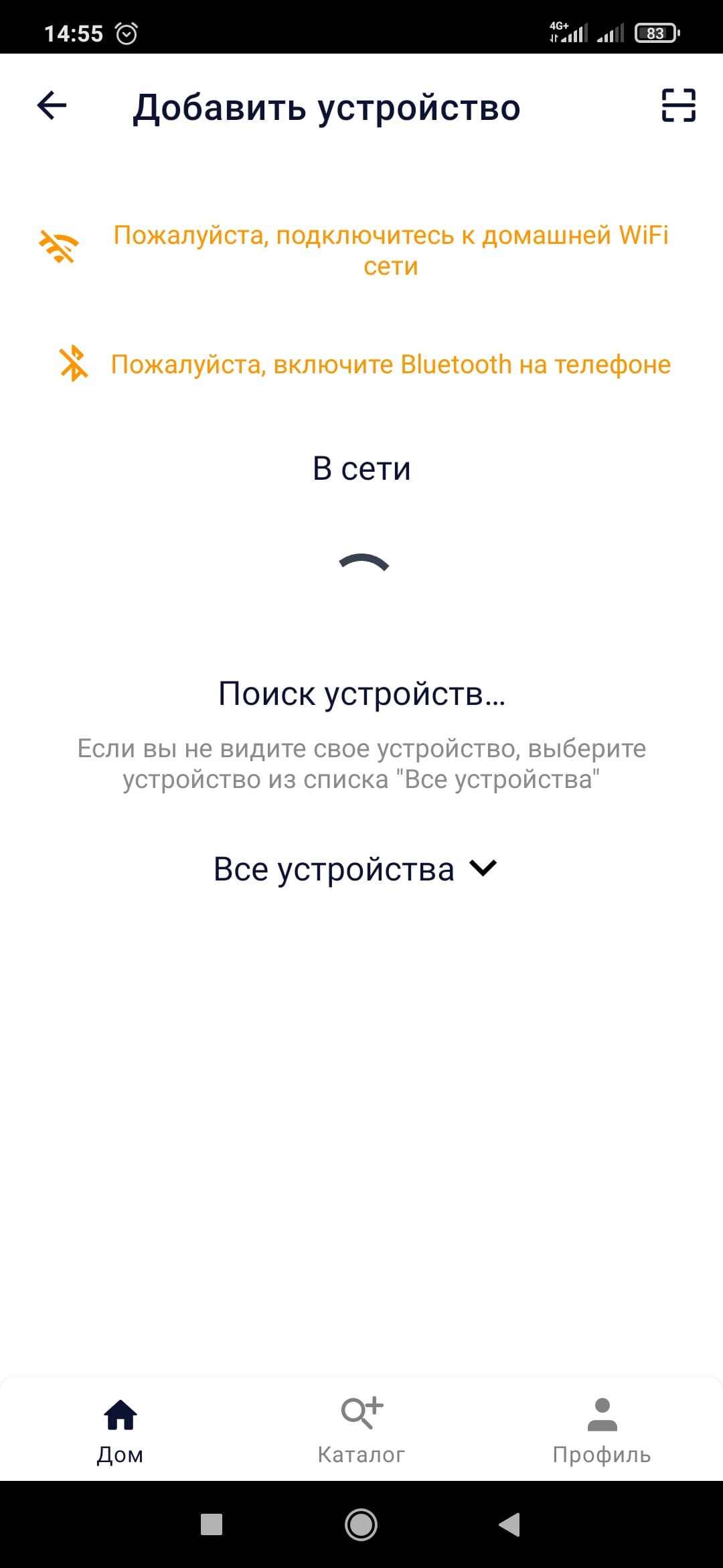 Первым делом приложение просит вас подключиться к Wi-Fi и включить Bluetooth (забегая вперед, Bluetooth понадобится вам только на этапе сопряжения смартфона с устройством).
