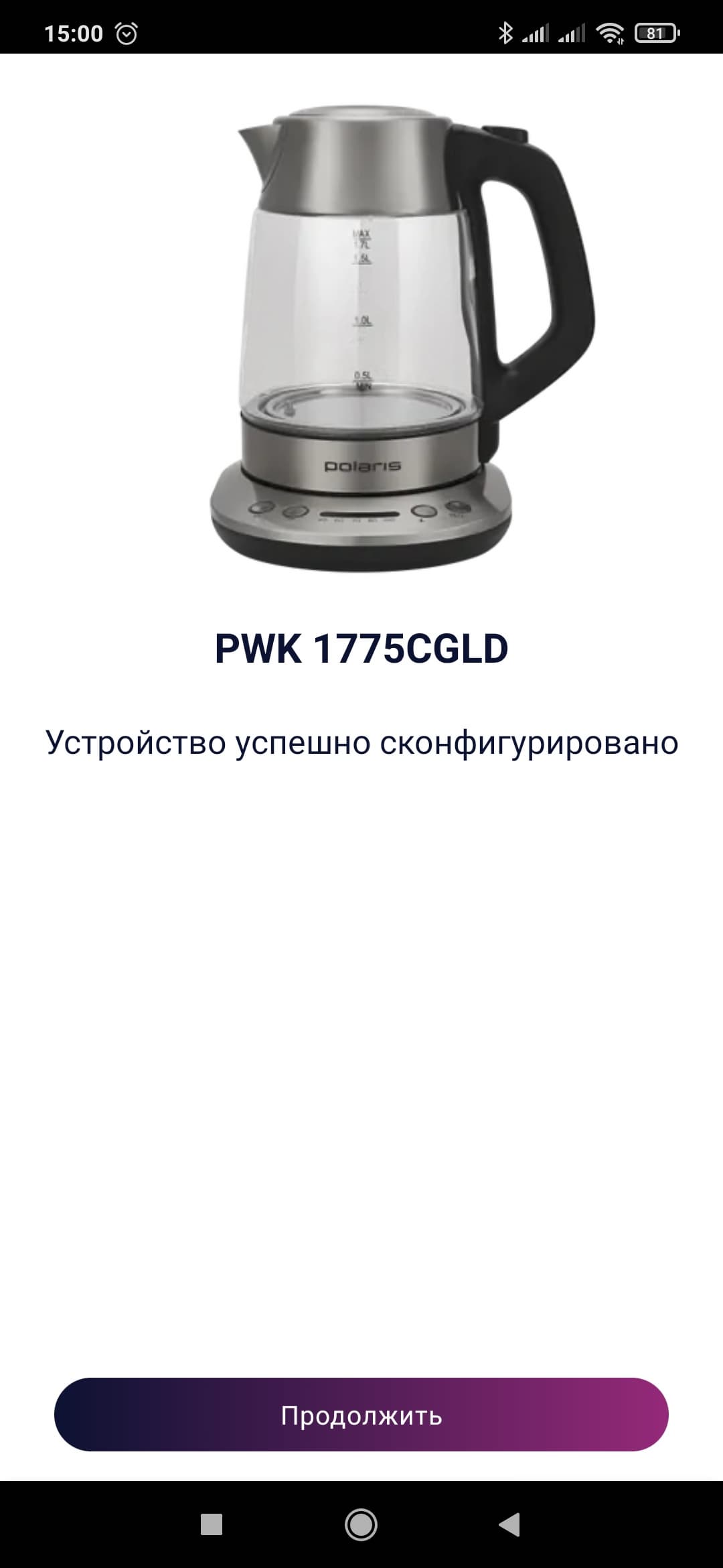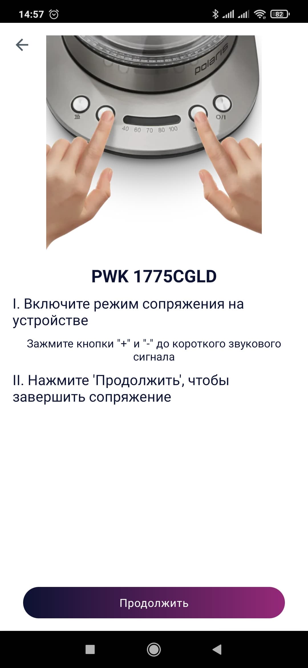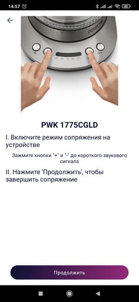 Затем необходимо найти PWK 1775CGLD во вкладке «Все устройства» (их там немного, так что искомый прибор находится быстро). На экране появится изображение прибора и предложение либо продолжить сопряжение, либо перейти в демо-режим. Жмем «Продолжить». Под изображением чайника появляется кнопка «Открыть настройки Wi-Fi» — нам нужно тапнуть по ней и подключиться к сети PWK-1777CGLD, а затем вернуться в приложение. IQ Home продолжит на пальцах объяснять, что делать дальше — в данном случае необходимо перевести сам чайник в режим сопряжения.