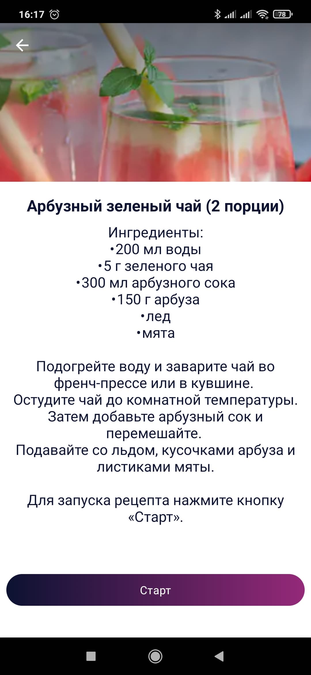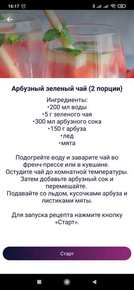 Под каждым рецептом есть кнопка «Старт» — она запускает подогрев воды до необходимой для выбранного напитка температуры.