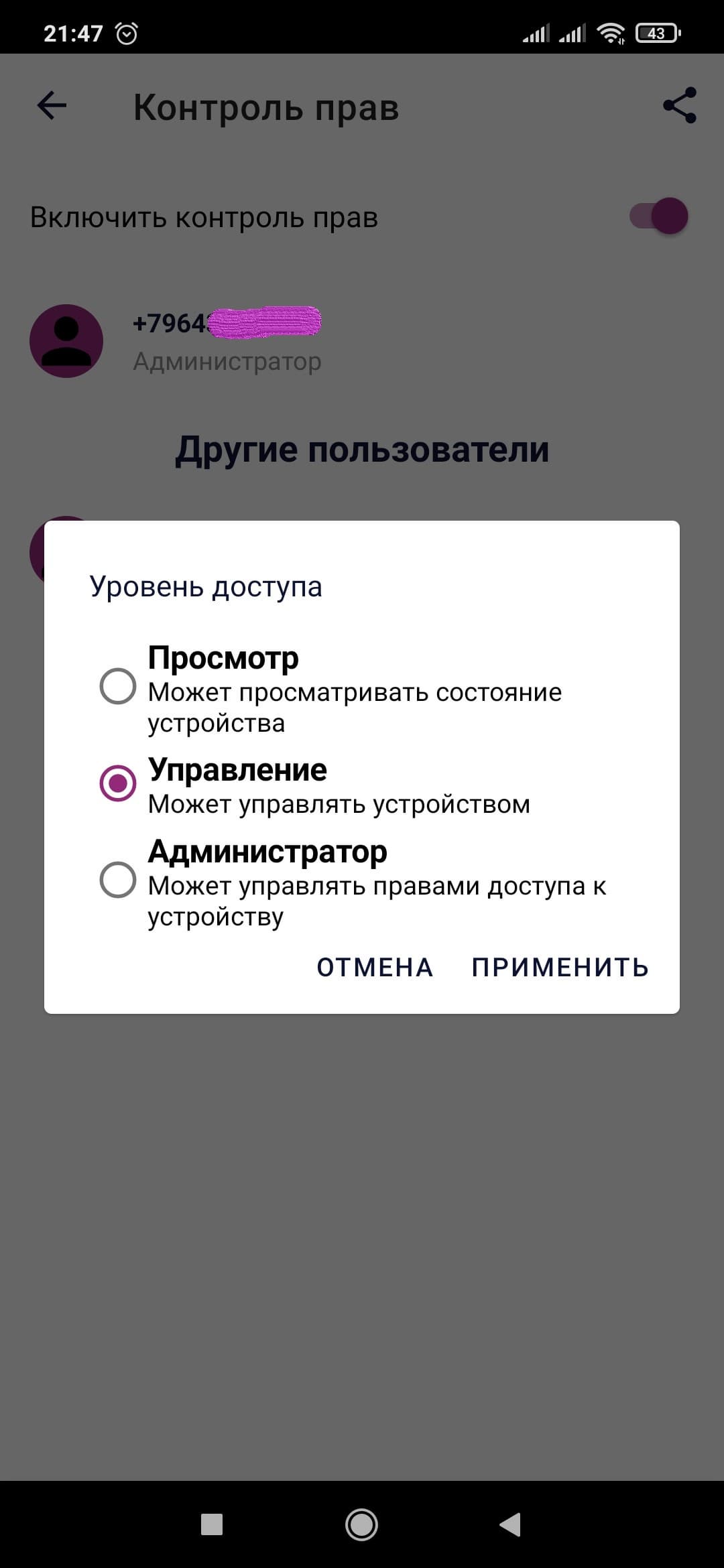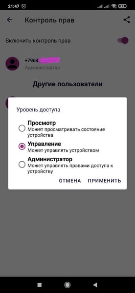 В настройках вы также можете поделиться доступом к устройству. Во вкладке «Контроль прав» достаточно нажать на значок «Поделиться» и через любой удобный вам мессенджер адресат получит ссылку, пройдя по которой и установив приложение IQ Home, получит доступ к вашему чайнику. Не забудьте включить перед этим контроль прав! Тогда обладатели ссылок попадут в список пользователей и вы, как администратор, сможете управлять их уровнем доступа к PWK 1775CGLD.