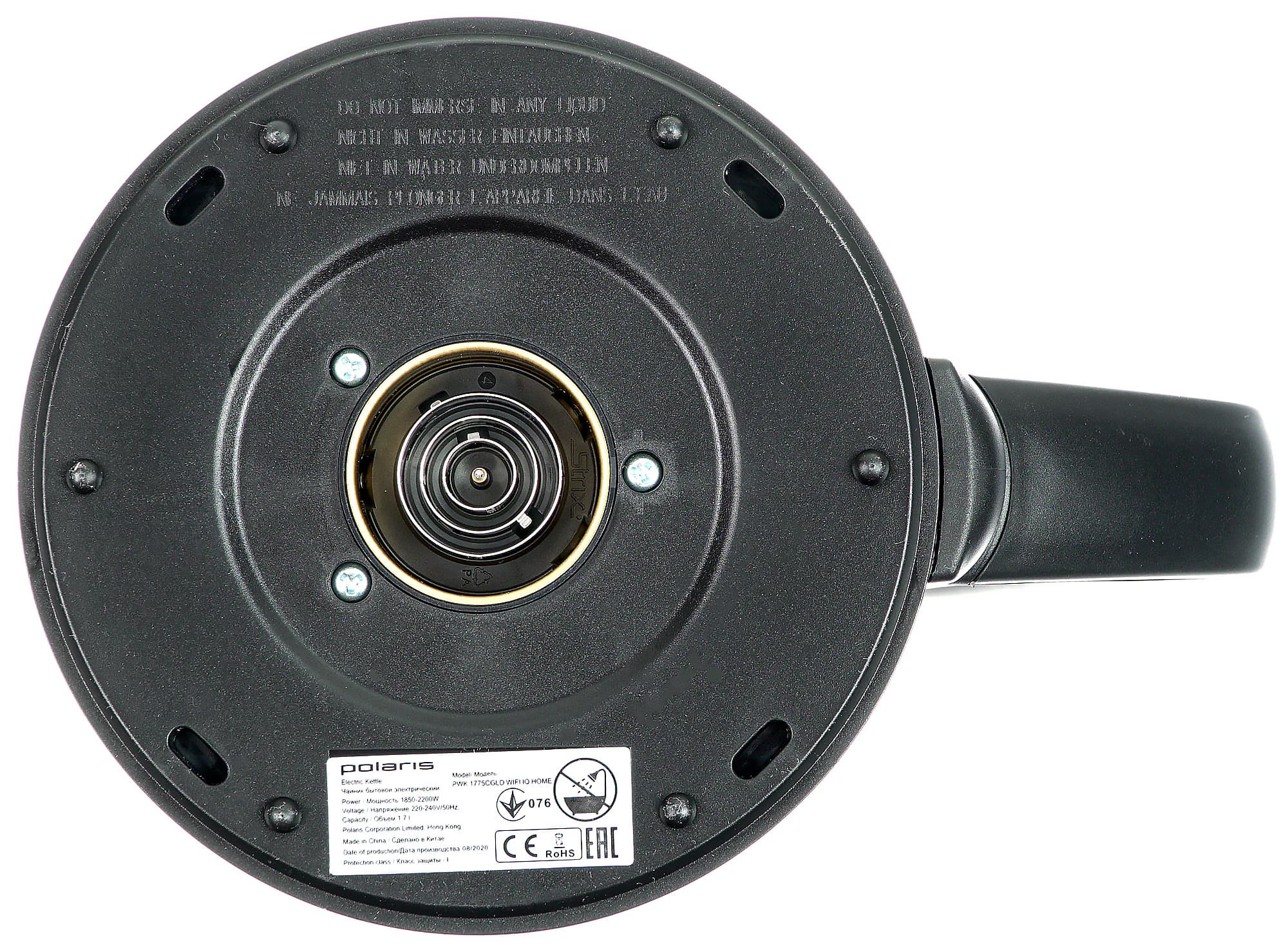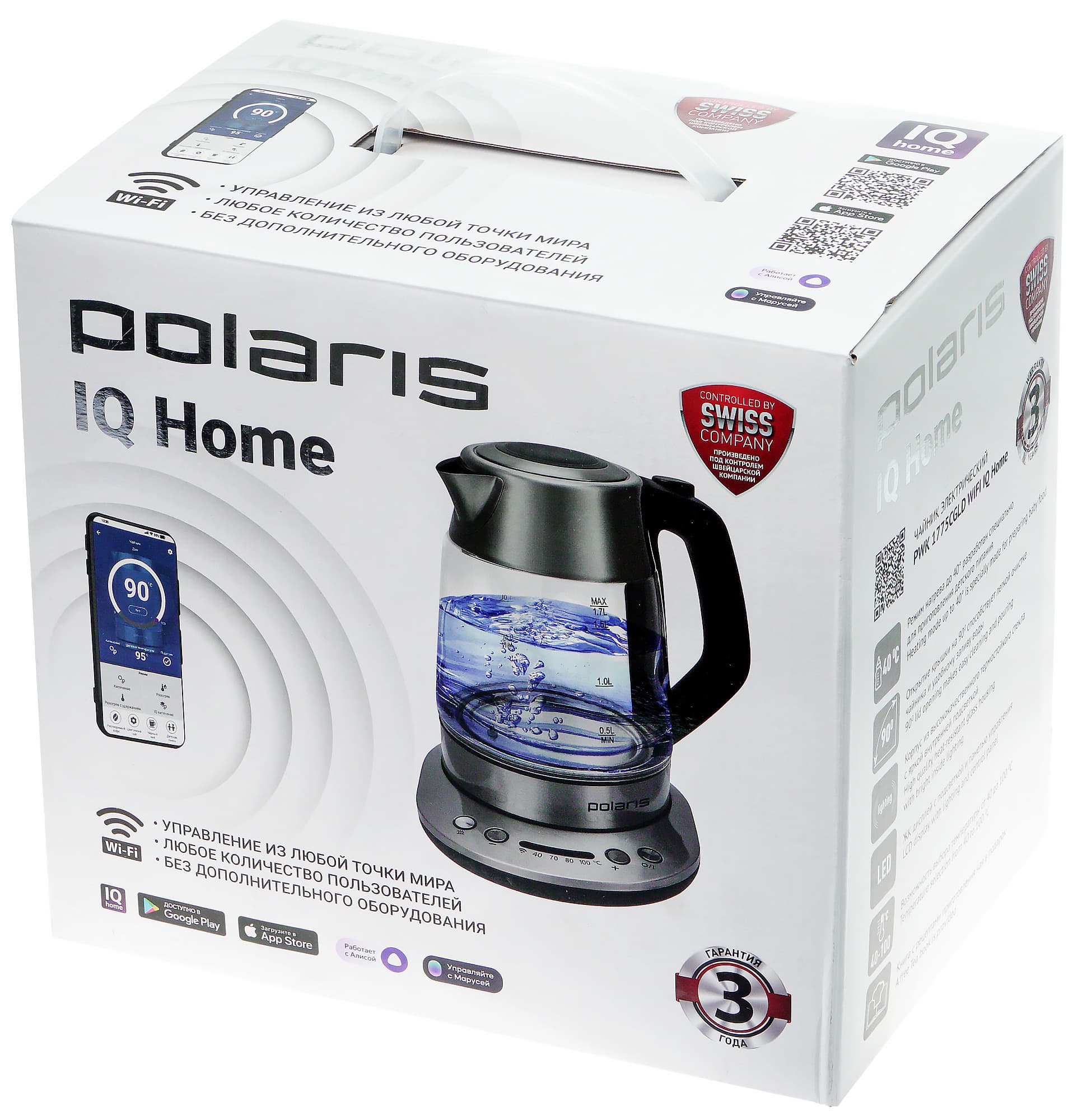 Чайник прибыл в нашу лабораторию в белой коробке с логотипом Polaris и изображением PWK 1775CGLD WIFI IQ Home. Почти на каждой стороне упаковки — сообщения от том, что чайником можно управлять со смартфона по Wi-Fi, и преимуществах такого способа.
