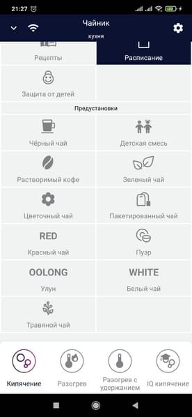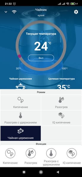 На экране нашего телефонного пульта можно увидеть текущую температуру воды в чайнике и кнопку питания под ней, тип подключения (Wi-Fi или мобильный интернет), выбранный ранее режим и его целевую температуру. Здесь же основные функции чайника.