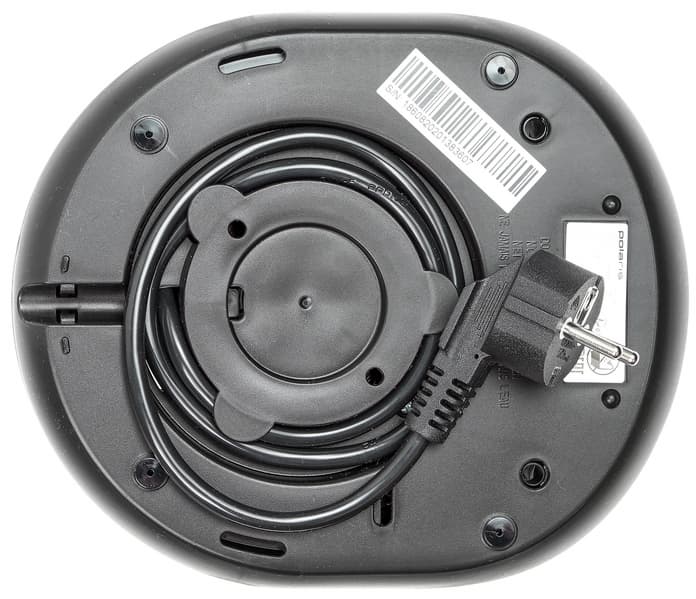 На нижней части базы — прорезиненные ножки и отсек для хранения шнура. Слева виден паз — через него нужно вывести шнур, чтобы подставка была устойчивой.