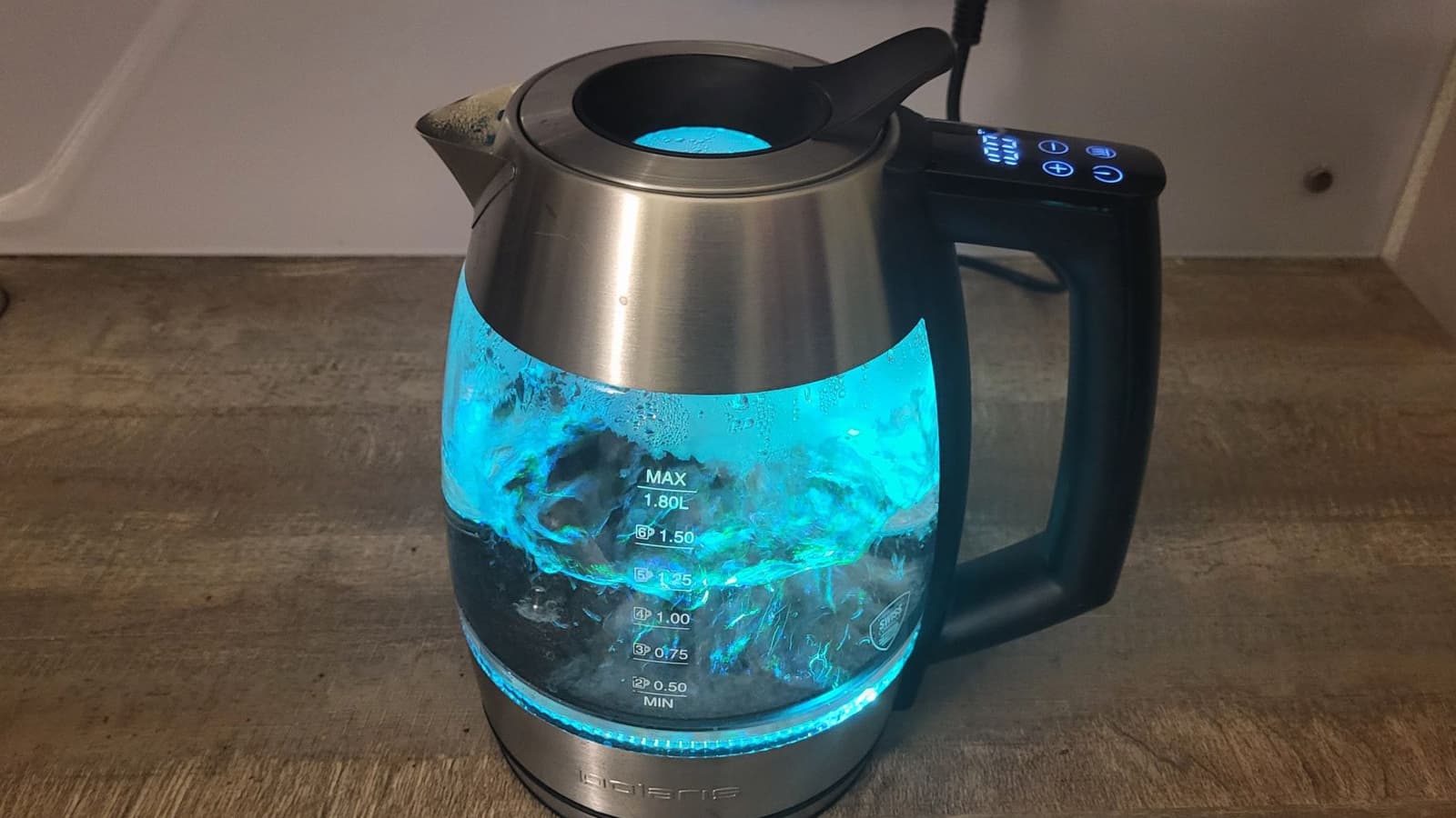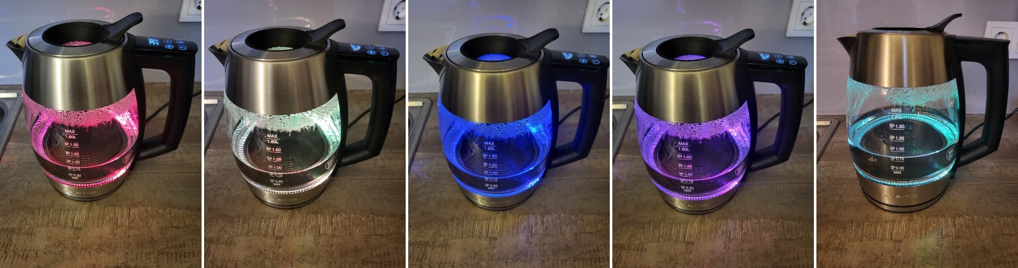 Чайник нам понравился и своим дизайном, и прозрачностью колбы, но особенно нам понравилась функция ночника и то, как подсветка меняет цвет в зависимости от температуры воды при установке чайника на базу. Потом, правда, подсветка становится либо выбранного цвета, либо цвета заданной температуры нагрева.