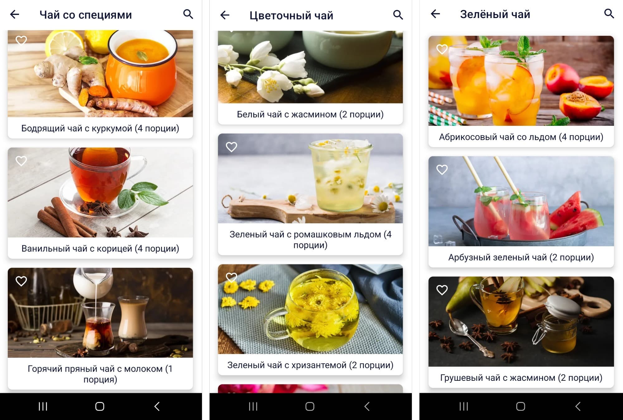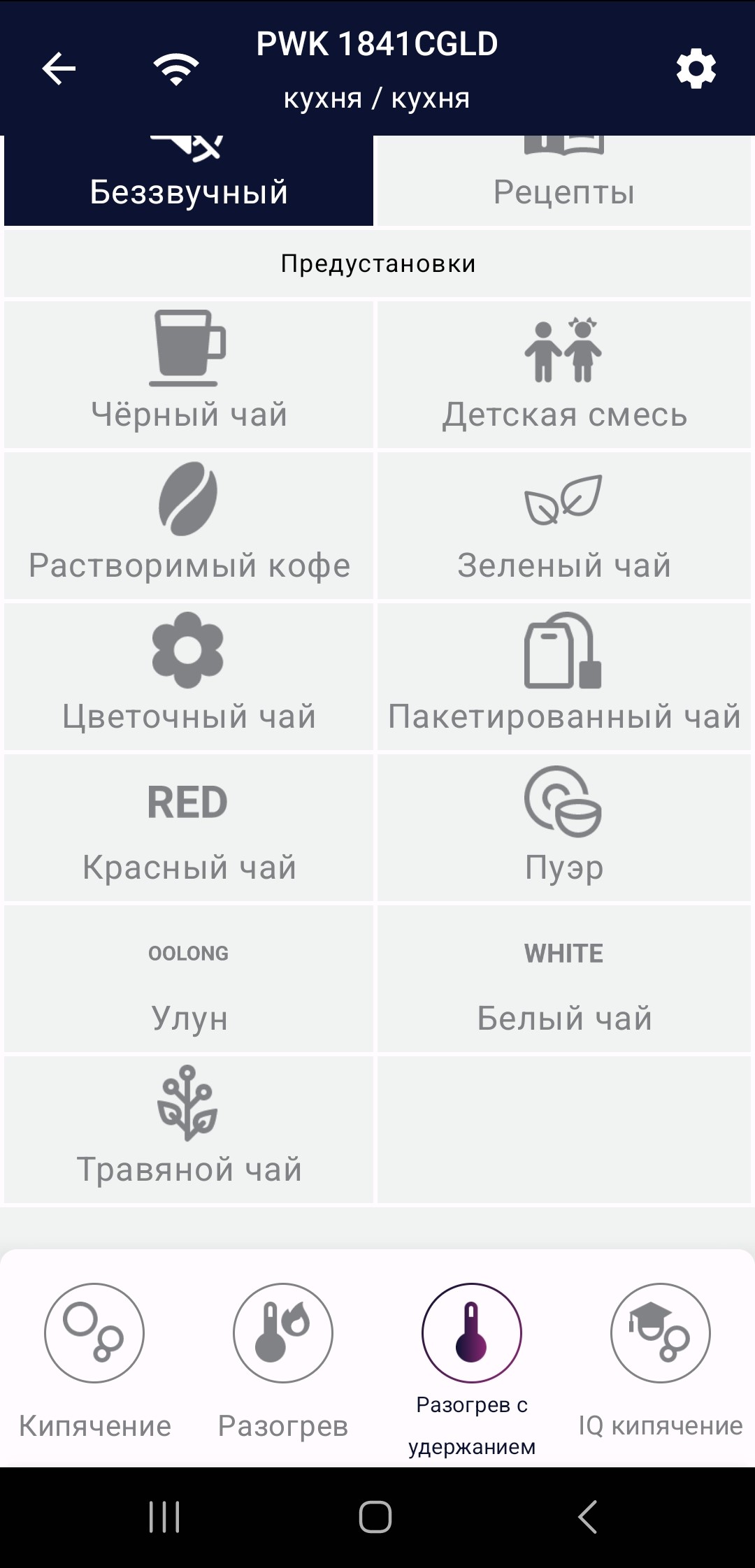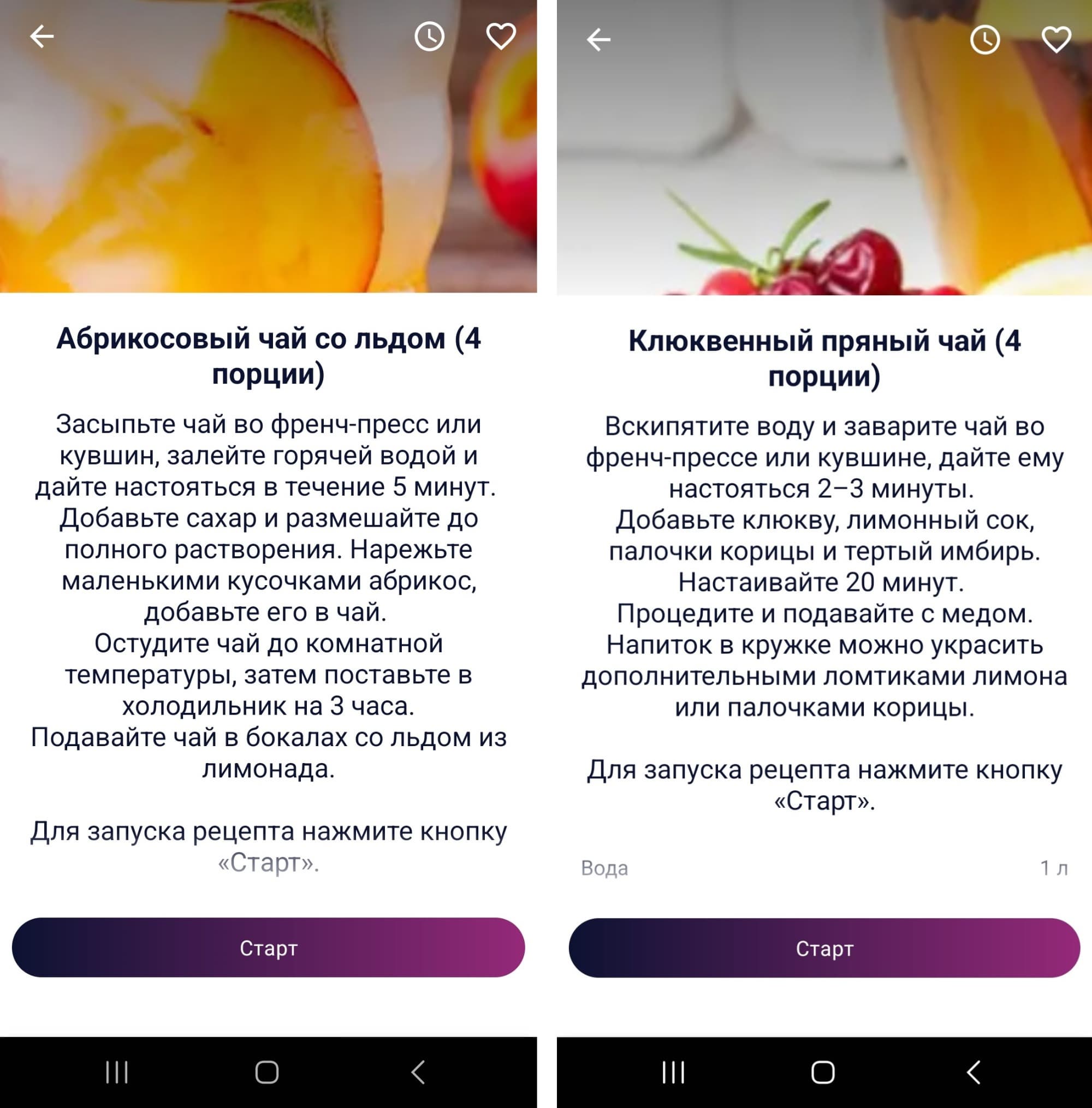 Со страницы рецепта можно запустить чайник в требуемом для приготовления данного вида чая режиме.
