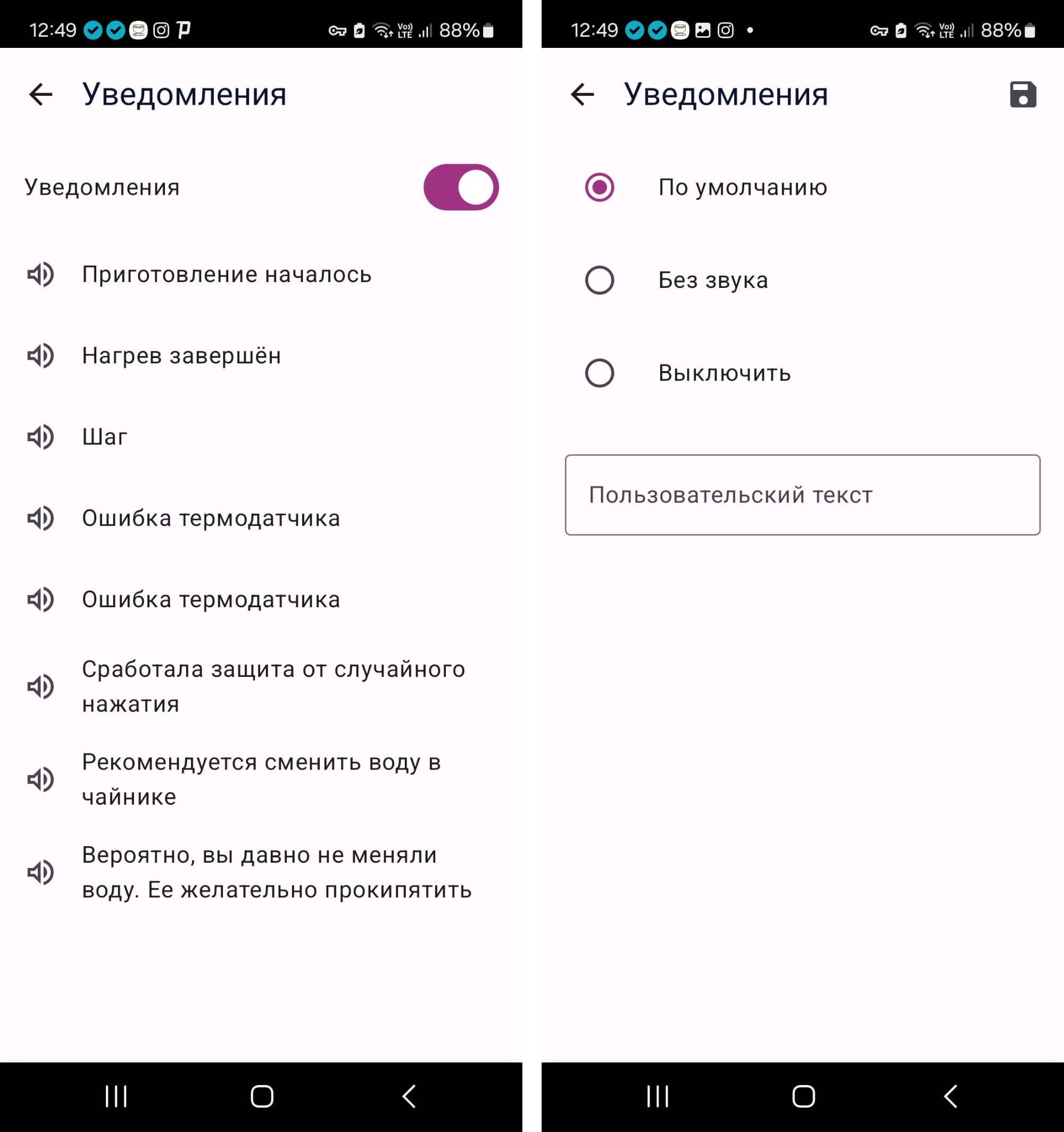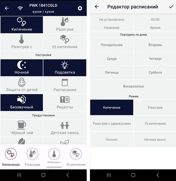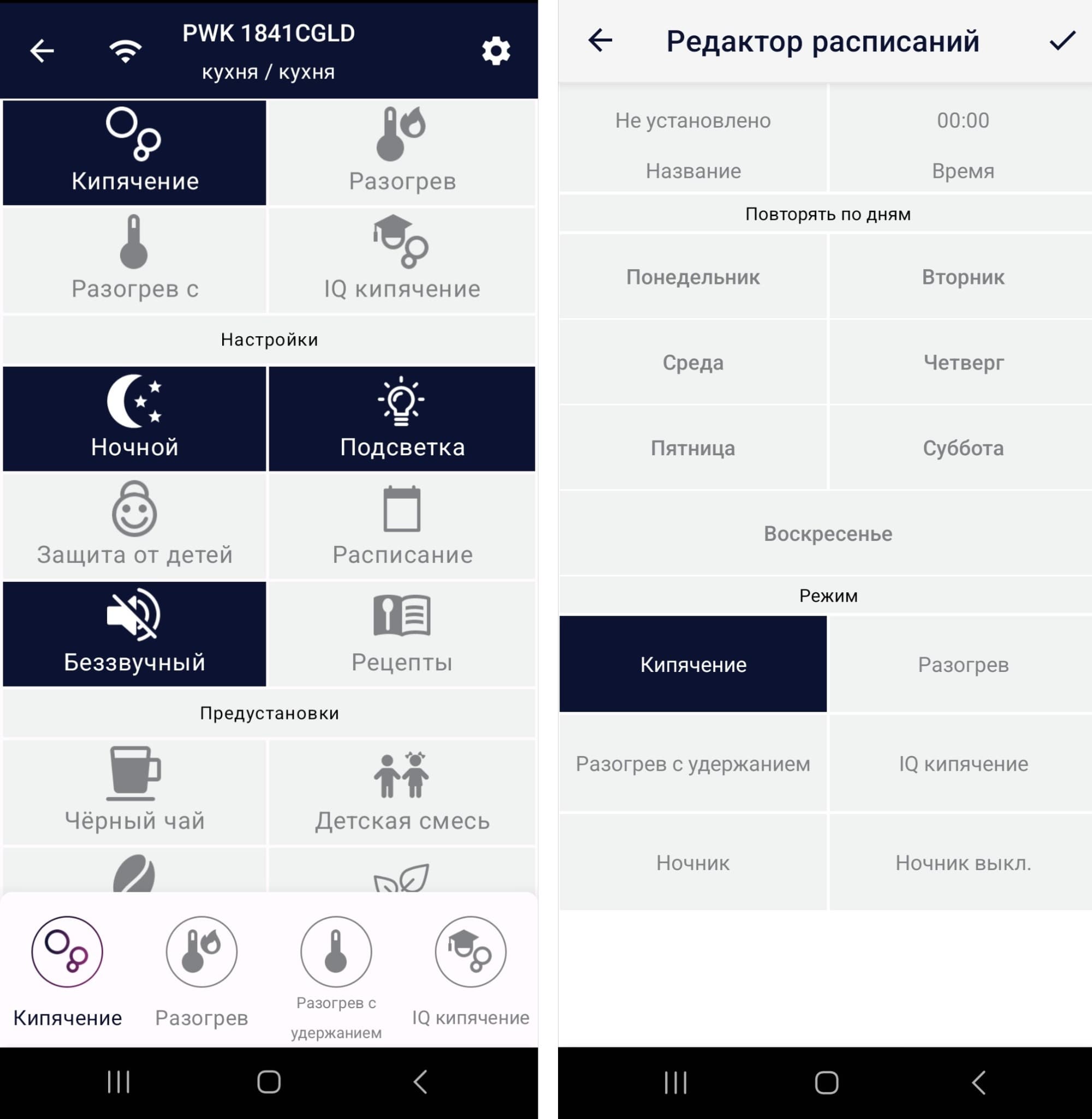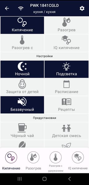 Приложение IQ Home тоже показалось нам полезным: в нем можно греть воду до любой температуры от 30 до 95 °C (шаг — 5 °C), выбрать рецепт интересного и необычного чая, задать расписание для включения чайника, отключить или включить подсветку, а также выбрать цвет подсветки (признаемся, что это нам особенно понравилось), а также отключить звуковые сигналы.
