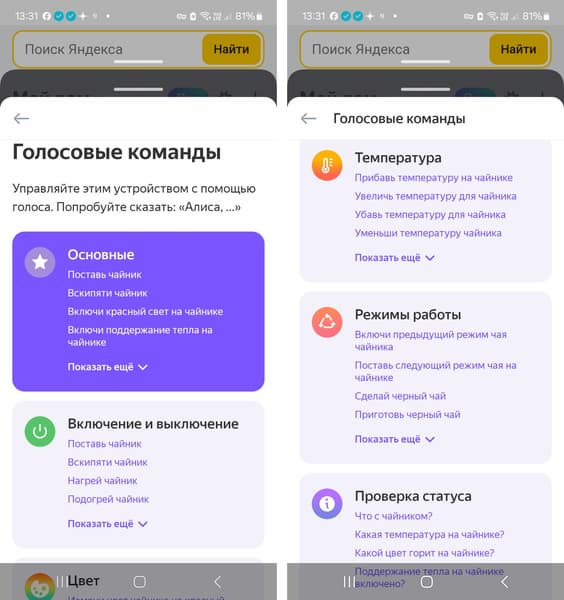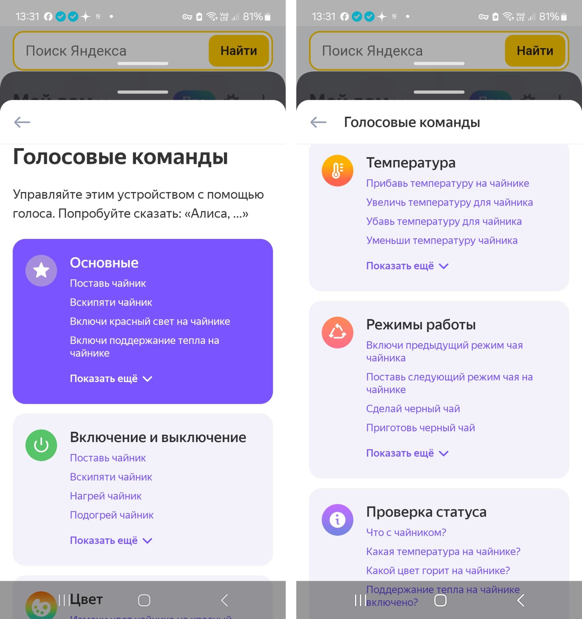 Команды для Алисы стандартные, и никаких проблем при управлении чайником с помощью голосового помощника у нас тоже не возникло.