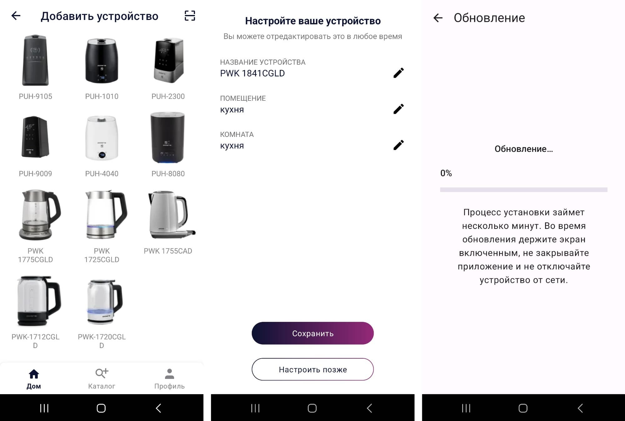 Для работы с приложением IQ Home необходимо вначале установить приложение, а потом подключить к его к домашней сети Wi-Fi. Вначале производитель предложил добавить устройство (и для этого нам пришлось обновить приложение IQ Home, поскольку в старой версии нашего чайника не было). Для сопряжения телефона с прибором мы воспользовались модулем NFC, установленным на ручке чайника, и подключение произошло у нас настолько быстро, что скриншоты мы сделать не успели.