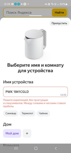 Яндекс предложил нам выбрать название и комнату для устройства.