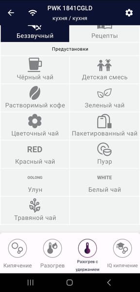 Также на главном экране можно выбрать температурные режимы, предустановленные для разных видов чая: