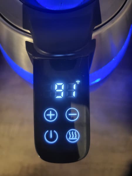 Приложение IQ Home позволяет установить нагрев от 30 до 100 °C с шагом в 5 °C. Функциональность приложения нас в целом устроила и не вызвала нареканий, но за время пользования чайником мы все же поймали себя на том, что проще, проходя мимо, нажать кнопку на чайнике, чем брать телефон и влезать в приложение. С другой стороны, если ты сидишь в комнате, а чайник находится на кухне — почему бы и не включить его из комнаты? Также можно включить чайник утром, не вставая с кровати.
