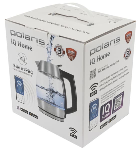 Polaris PWK 1841CGLD прибыл к нам в небольшой белой картонной коробке, оформленной в фирменном стиле. На одной из сторон коробки изображен смартфон и написано IQ Home, из чего можно прийти к выводу, что чайник оснащен системой дистанционного управления — из любой точки мира. Также мы видим надпись SilentPro и указание, что чайник работает тихо, «в 2,5 раза тише других чайников».