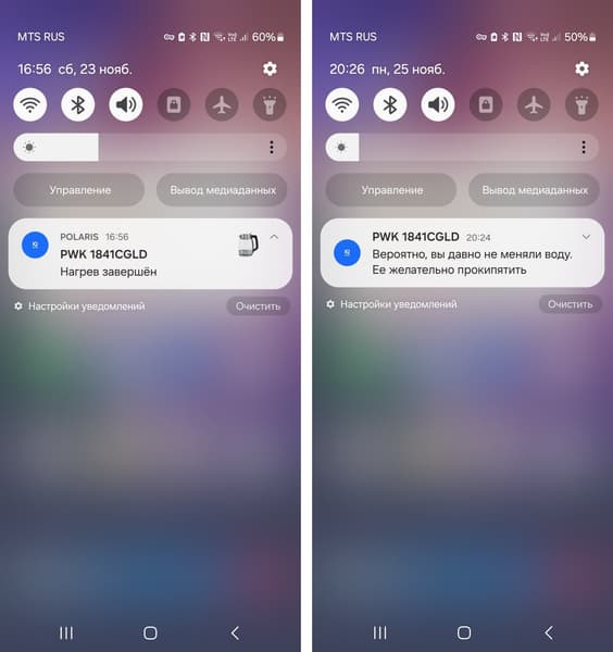 Для кипячения воды нужно включить чайник нажатием на сенсорную кнопку «Вкл./Выкл.» расположенную на панели управления. При этом прозвучит одиночный звуковой сигнал и загорится внутренняя подсветка колбы красным цветом. После закипания воды чайник выключится автоматически и прозвучит двойной звуковой сигнал. В полученном нами чайнике по умолчанию были выключены звуковые сигналы, что нас очень порадовало. Звуковые сигналы отключаются через приложение Polaris IQ Home, работу которого мы и рассмотрим ниже.