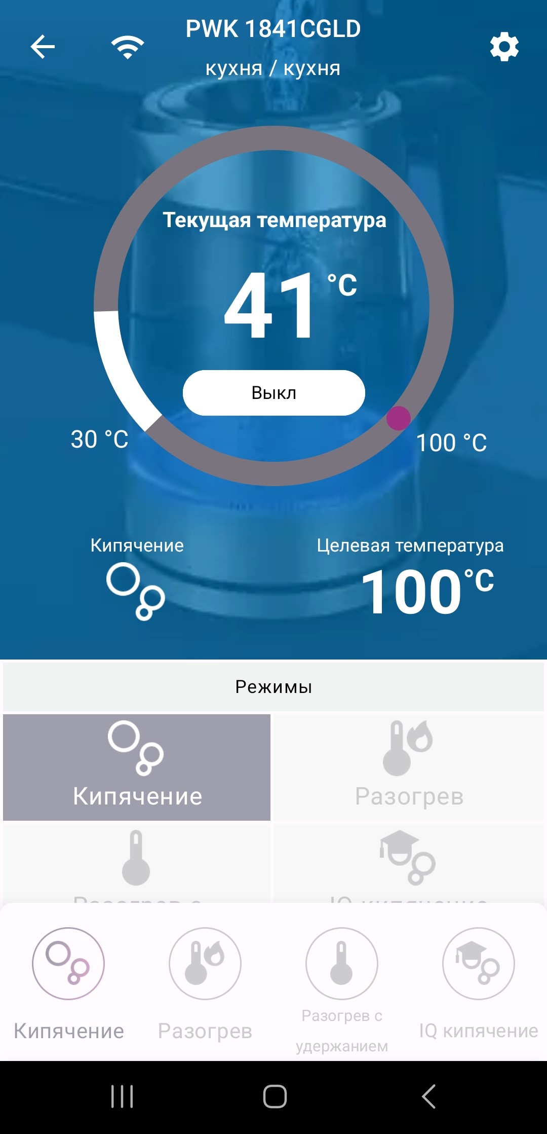 В приложении можно увидеть текущую температуру воды в Polaris PWK 1841CGLD, выбранный режим и его целевую температуру, а также тип подключения (Wi-Fi или мобильный интернет). Чайник можно запустить в одном из четырех режимов: